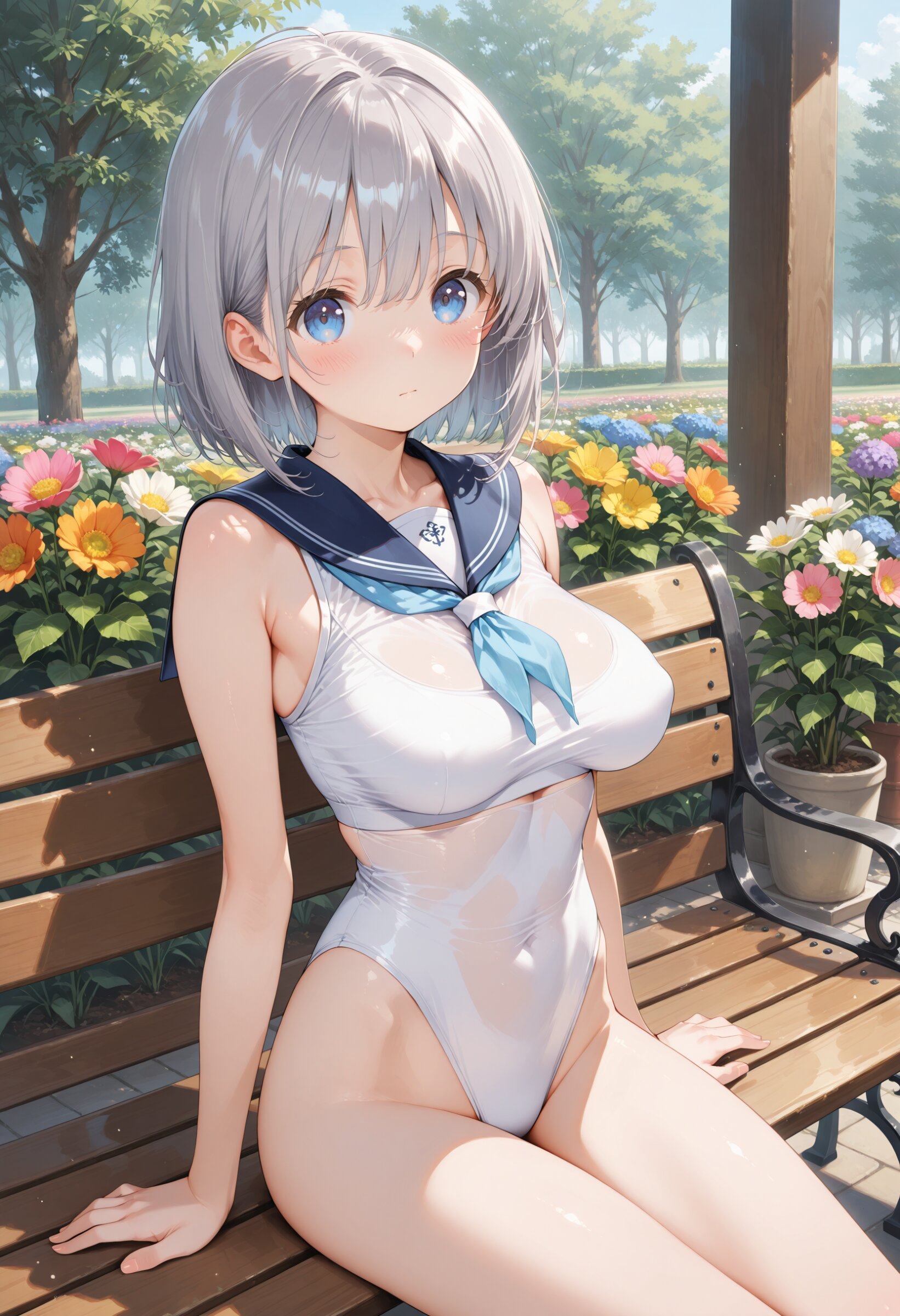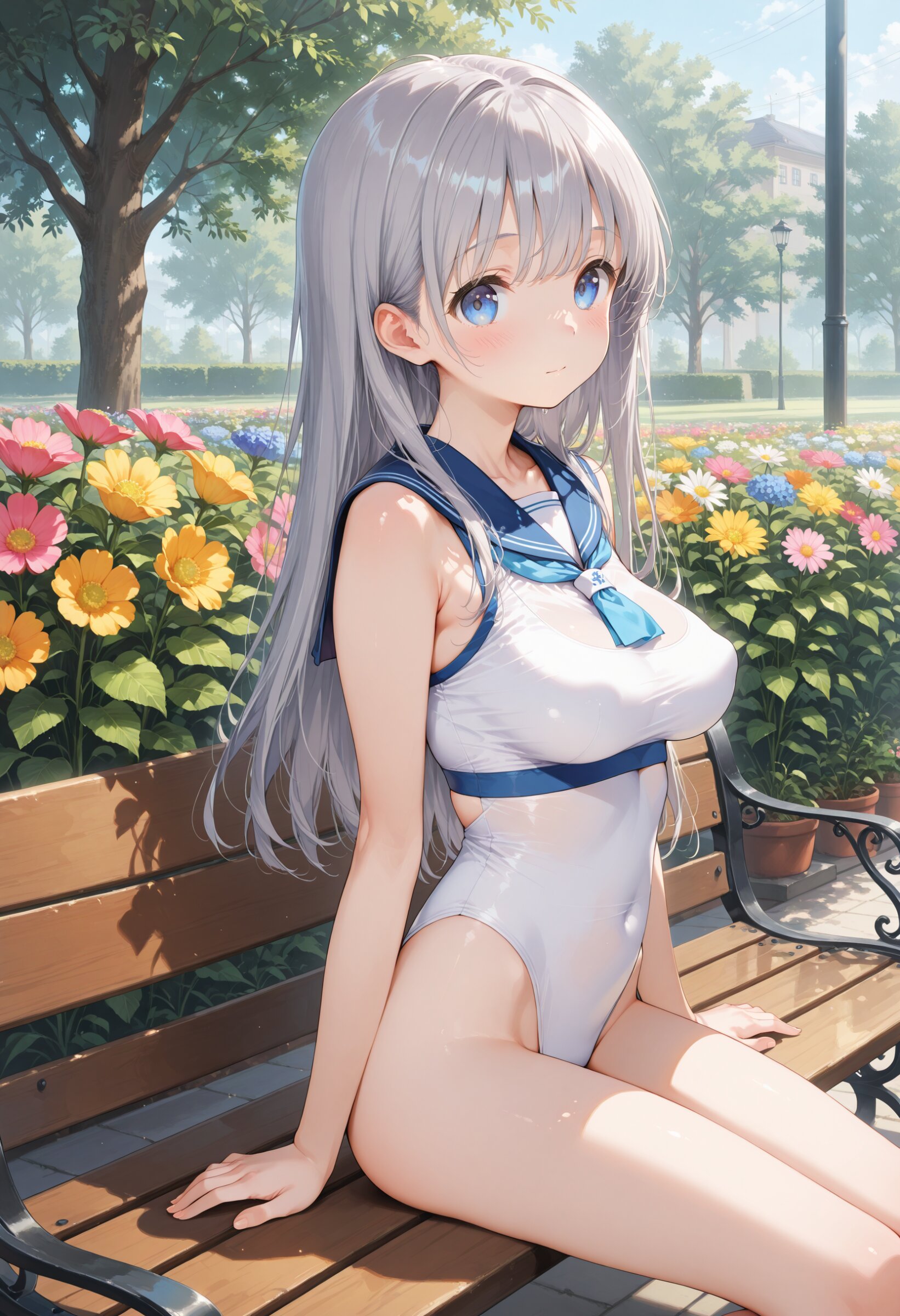 masterpiece, best quality, amazing quality, general, fine detail, official art, 1girl, loli, petite, , silver hair, blue eyes, , white high-cut leotard, sailor collar, (white sports bra visible through leotard:1.2), sleeveless, slim legs, big breasts, perky breasts, firm peaks, flower garden, sitting on bench, innocent expression , cowboy shot, from side, ,