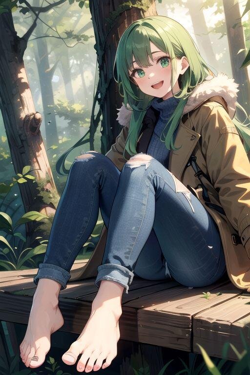 森にて素足にジーンズの緑髪少女