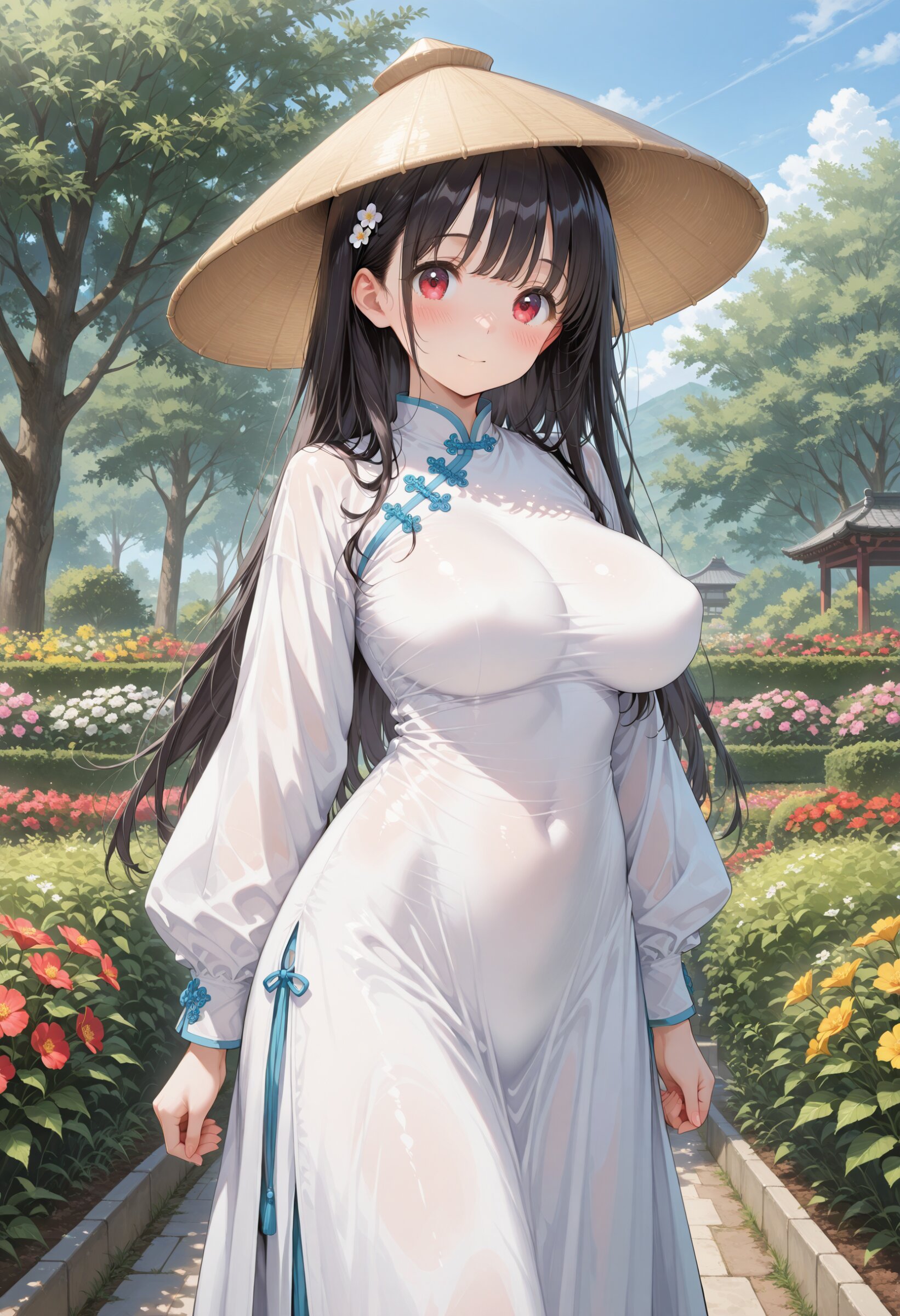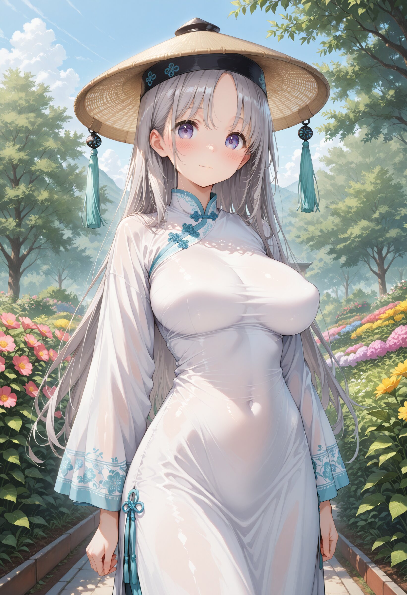 masterpiece, best quality, amazing quality, general, fine detail, official art, 1girl, loli, (petite:1.2) , student, beautiful silver hair, long hair, beautiful eyes, (white vietnamese long dress:1.2), vietnamese Non La Conical hat, shaped waist, big breasts, impossible clothes, perky breasts, fully covered breasts, perfect fit, look at viewer, innocent expression, , in garden, cowboy shot, blush, ,,look at viewer,
