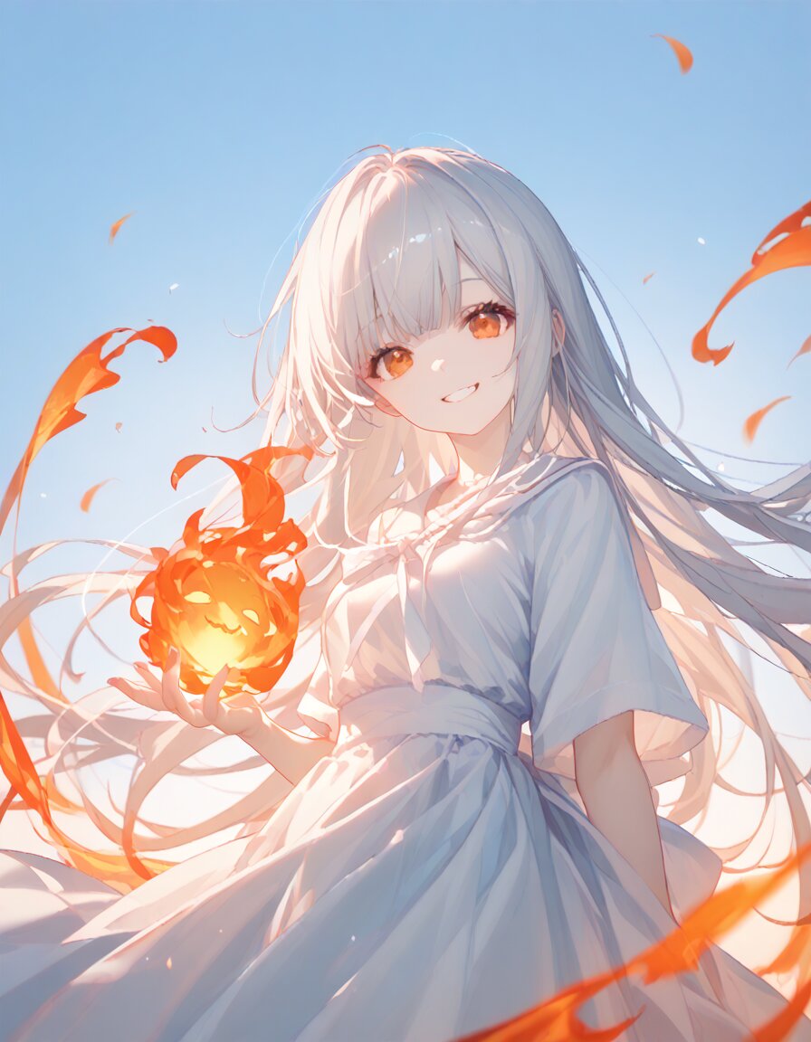 score_9, score_8_up, score_7_up, score_6_up, source_anime, rating_safe, quality_masterpiece, quality_best, quality_high BREAK fire, 1girl, solo, ghost girl, silver hair, long hair, pale skin, orange eyes, smile, cute ghost