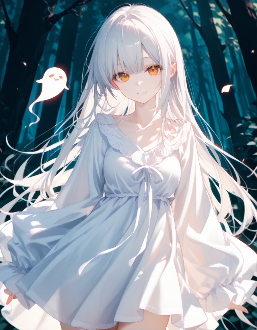 score_9, score_8_up, score_7_up, score_6_up, source_anime, rating_safe, quality_masterpiece, quality_best, quality_high BREAK forest, 1girl, solo, ghost girl, silver hair, long hair, pale skin, orange eyes, smile, cute ghost