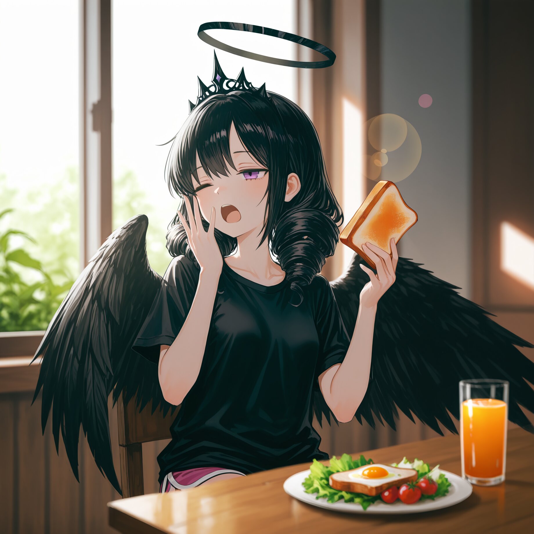 masterpiece, best quality, absurdres, 8k, ultra detailed, aesthetic, very aesthetic, newest, ultra-detailed,<lora:Fixhands_anime_bdsqlsz_V1:0.5>, <lora:bold-16oa:-0.5>, (realistic:0.3),BREAK (shallow depth of field,Gaussian Blur,lens flare:1.6),1girl,black twin drill hair, purple eyes, jitome,expressionless,(tiara, black wings folded behind,jitome:1.1),black halo,small breasts,(yawning:1.3),black t-shirt,dolphin shorts,breakfast scene, breakfast table,toast, salad, fruit, orange juice,sitting at table,holding toast, enjoying meal,bright morning sunlight,sunlight through window,warm lighting, soft glow,cozy kitchen, morning atmosphere,plants, wooden table, homey feeling,peaceful morning, relaxing moment,fresh start of the day,anime style, clean lineart,soft shading, detailed food,,(black hair:1.1),<lora:USNR STYLE_XL_loha:0.8>