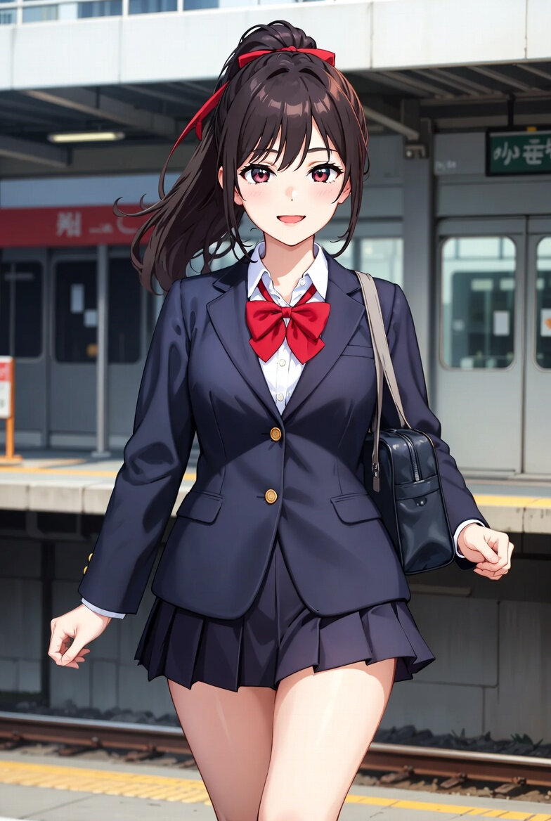 日本人女子高校生18歳のリアルなイラスト。ブレザーの制服を着ていて、通学のために元気に歩いている。ミニスカート。背景は日本の駅。