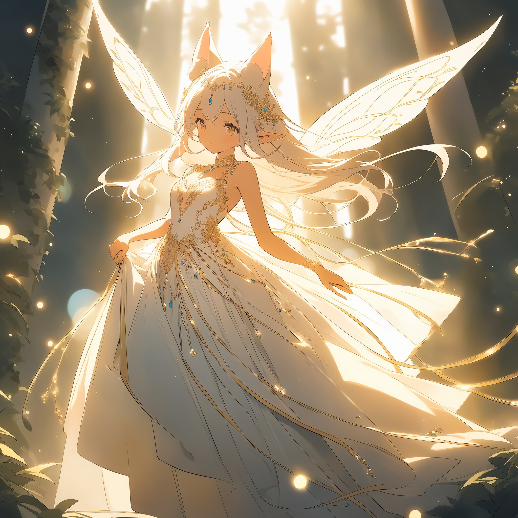 A cat-eared goddess in a sun-drenched floating garden, ancient white marble pillars covered in ivy, golden particles of light dancing in the air, pointed feline ears adorned with jewelry, wearing an ornate white silk gown with gold embroidery, ethereal wings made of pure light, bright and airy atmosphere, divine glow, soft cinematic bokeh, masterpiece, concept art style, sharp focus.