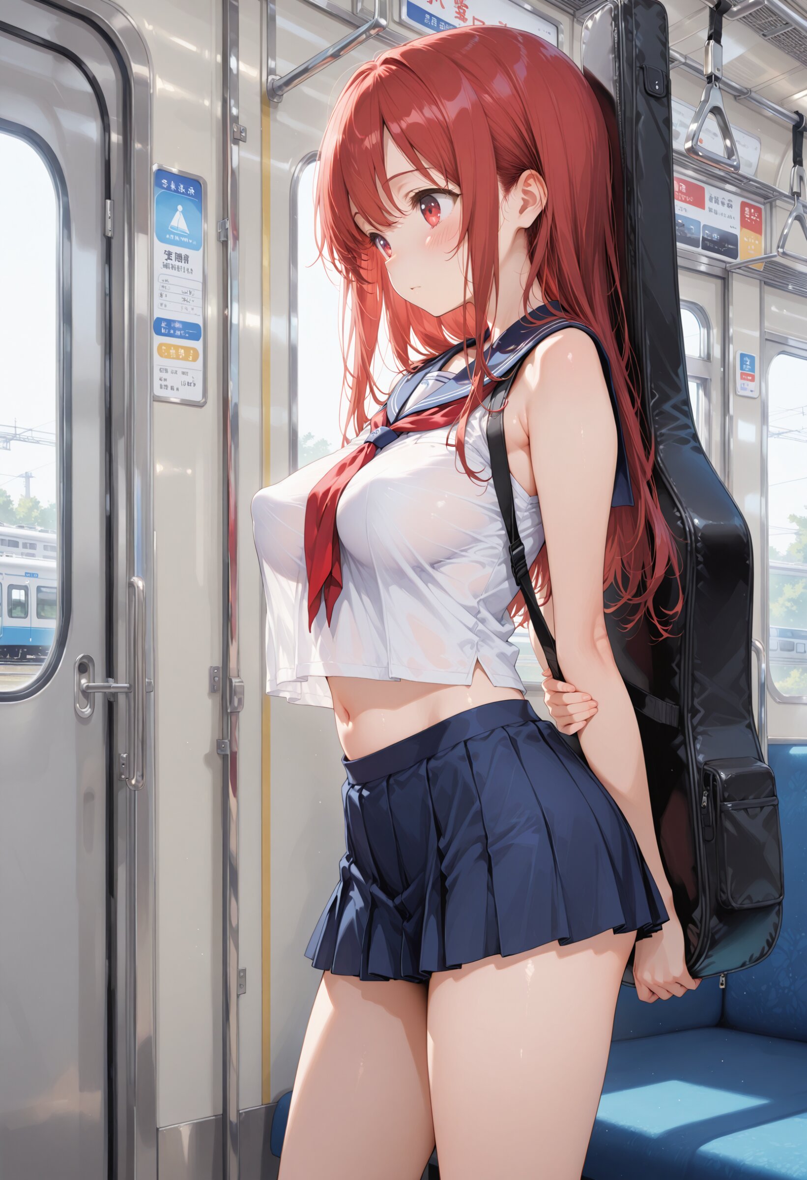 masterpiece, best quality, highres, ultra-detailed, extremely detailed, detailed, 1girl, loli, petite, beautiful hair, long hair, red hair, school sailor dress, sleeveless, navy blue miniskirt, beautiful legs, summer, big breasts, navel, (perky breasts:1.2), platform, train interior, innocent expression, from side, standing, ,Carrying a guitar case on back, happy,, cowboy shot