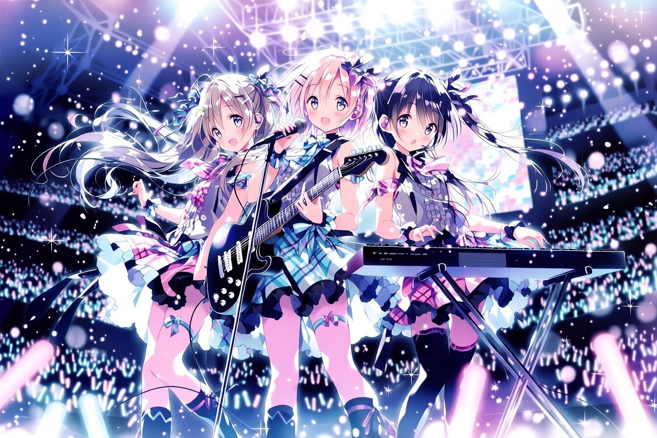 (masterpiece, best quality, highres, 8k wallpaper:1.2), extremely detailed, insanely detailed, (ultra-detailed eyes, sparkling eyes:1.1), (soft lustrous skin), beautiful girl band, bishoujo group, youthful and energetic charm, harmonious team chemistry, vocalist, guitarist, keyboard player, three members standing together on stage, confident and lively expressions, each with a distinct personality yet unified presence, expressive eyes and long lashes, smooth radiant skin, perfectly balanced proportions, matching outfits, coordinated idol-band costumes, tartan check skirts, vivid and stylish pattern, skirts slightly flared for movement, ribbons tied at the waist, cute and eye-catching accents, fitted tops with subtle frills and stage-ready details, cohesive color palette, fashionable and cute without excess, (vocalist) holding a microphone, singing passionately, dynamic pose, (guitarist) playing an electric guitar, energetic stance, fingers in motion, (keyboard player) focused and elegant, hands dancing across the keys, calm yet powerful aura, (cinematic lighting), (soft focus), bright concert lighting with colorful spotlights, skin-flattering glow, tyndall effect, bloom, elegant rim lighting outlining hair, skirts, and instruments, (glowing light:0.8), dynamic group composition, depth of field, rule of thirds, looking toward the audience/viewer with excitement and confidence, concert stage background, glowing LED panels, light beams, floating sparkles, cheering crowd silhouettes, vibrant atmosphere, softly blurred background with vivid bokeh, transparent and energetic air, anime-style digital illustration, idol band aesthetic, cheerful and powerful mood, friendship and music theme, high-end commercial-quality illustration, lively, cute, and emotionally uplifting composition
