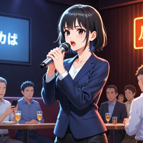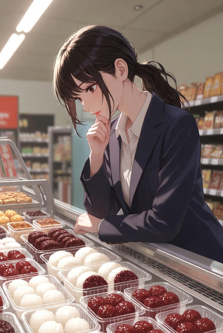 日本人女性25歳のデジタルイラスト。服装はビジネススーツ姿。スーパーの什器の前で、丸くしたお米に餡子と小豆に包んだ饅頭を買うか迷っている様子。