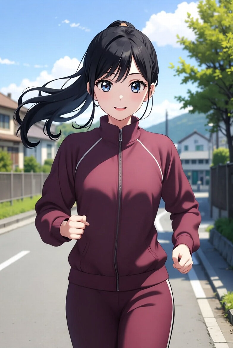 ラン練習中の日本人女性18歳のデジタルイラスト。黒髪ポニーテール。、長い髪が風になびいている、大きな青い瞳、優しい微笑み、清楚な雰囲気。エンジ色のジャージの上下を着ている。背景は郊外の住宅地の道路。鮮やかで透明感のある色彩