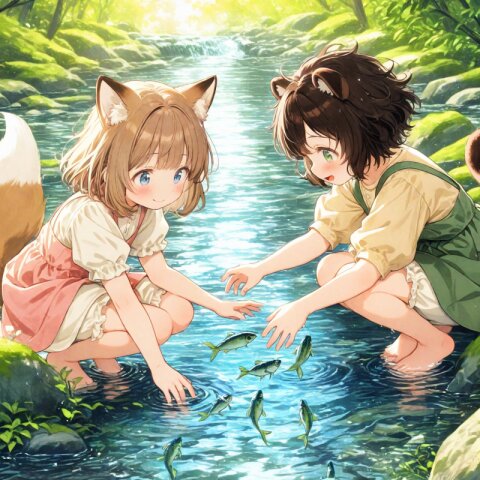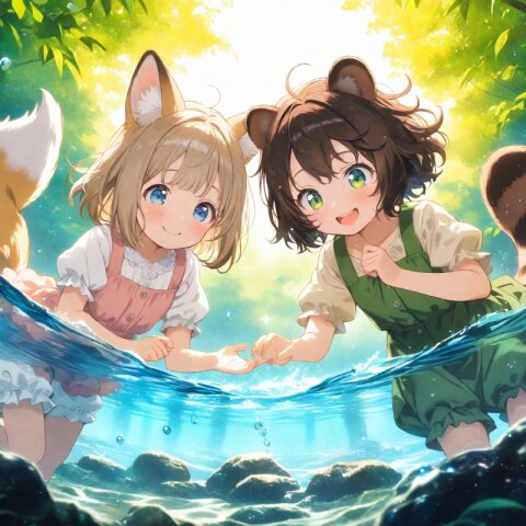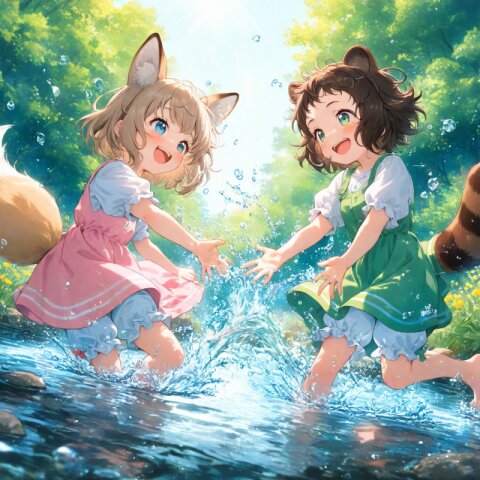 2girls, loli, mid, general, traditional media, picturebook-style, (watercolor and colored pencil texture), pastel colors, soft tone, no lineart, no outline, (drawing lines, Paper texture), ultra-detailed background, Very detailed costumes, (barasui:0.1), (oyari ashito:0.1), (masterpiece, best quality, amazing quality, very aesthetic, high resolution, ultra-detailed, absurdres,), dynamic angle, dynamic composition, dynamic pose, upper body, from above, tropical uninhabited island forest, lush green jungle, bright sunlight filtering through leaves, wooden campfire cooking setup, giant frying pan on firewood, a strange tree growing large eggs like coconuts, many white eggs hanging from branches, egg tree beside the girls, giant fried egg cooking in a large frying pan, sizzling egg yolk, steam rising, eating, closed eyes, food in mouth, (Fried egg), two small girls happily eating fried egg together, smiling, laughing, holding forks, enjoying delicious food, joyful expression, cute chibi proportions, BREAK loli, green eyes, tareme, dark brown hair, short hair, messy hair, short bangs, (dark brown raccoon ears, dark brown raccoon tail with striped pattern), happy, laughing, cheerful, green pinafore dress, small backpack, frilled bloomers,