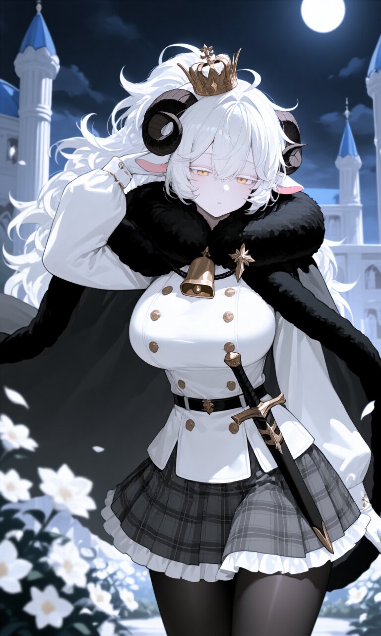 A 16-year-old tall and beautiful (sheep girl) with white skin and (large breasts:0.8) stands in a dreamy palace garden at night. She has pure white messy long hair tied in a ponytail, with strands playfully falling between her eyes, complemented by white eyebrows and a delicate, sleepy face with half-open eyes. Her sheep horns add a whimsical charm to her appearance. She wears a (White luxurious Prince costume with black fluffy woolen fur collar:1.6) with long sleeves, accented by a cowbell that jingles softly. Her outfit includes a (luxurious Grey plaid mini skirt with white frill hem:1.4), (luxurious Black pantyhose:1.3), and (luxurious White gloves:1.3). A (dagger on waist:1.3) hints at her noble status, while a (luxurious crown on head:1.4) completes her regal look. The (luxurious Black Cape:1.3) billows gently behind her as she stands amidst blooming flowers under the moonlight, with a hazy, calm atmosphere enhancing the romantic academia aesthetic. The palace features organic architecture with intricate details, and the cloudy sky adds to the magical, serene night scene.