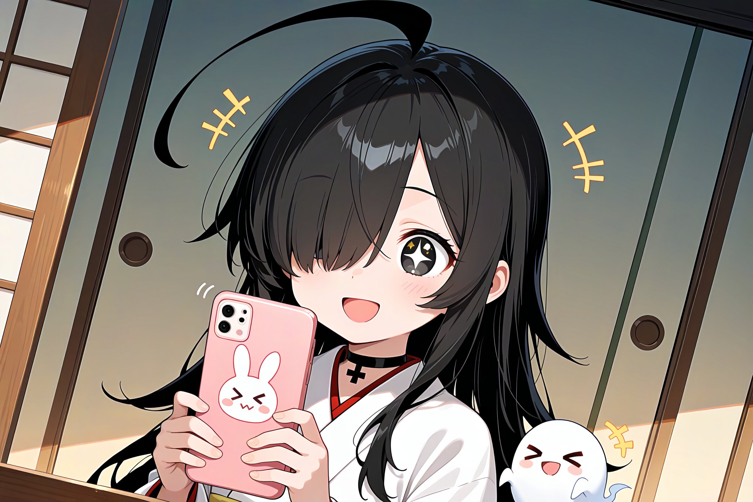 1 little girl, solo, diagonal angle, upper body, masterpiece, best quality, amazing quality, very aesthetic, single strand of hair, upward hair, sharp ahoge, dynamic hair, tension hair, shout lines, black hair, long hair, (hair over one eye:1.2), black eyes, +_+, open mouth, smile, cheerful, +++, notice lines, choker, white kimono, holding smartphone, rabbit print, ghost, > <, japanese room,