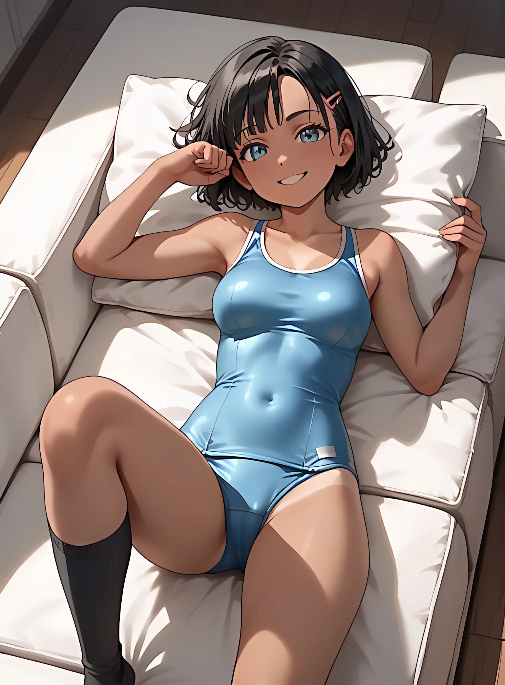 1girl,mesugaki,early teen,loli,tan,slender,black hair,short hair,medium breasts,narrow_waist,giggling,classic old-style school swimsuit, white over-knee socks, lying on a white sofa with soft cushion compression, relaxed and slightly curled pose, one knee gently bent, holding a small cushion, slightly high angle, very close-up composition, direct eye contact, bright and innocent smile, soft natural daylight, warm and gentle lighting, shallow depth of field, creamy background blur, clean and cozy atmosphere, delicate smooth skin texture, slight pressure marks from socks, subtle fabric tension, fine micro highlights on skin and fabric, soft fluffy shadows, pastel color tones, high detail, well-balanced composition