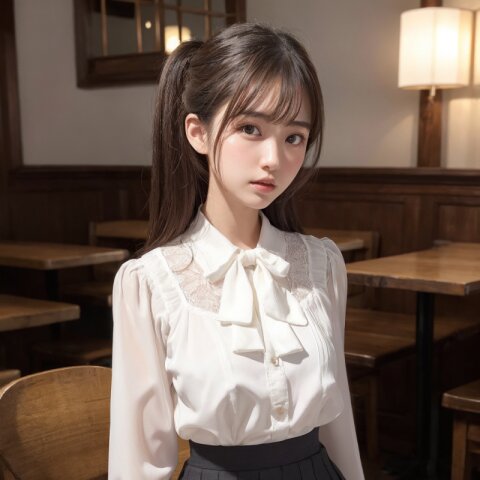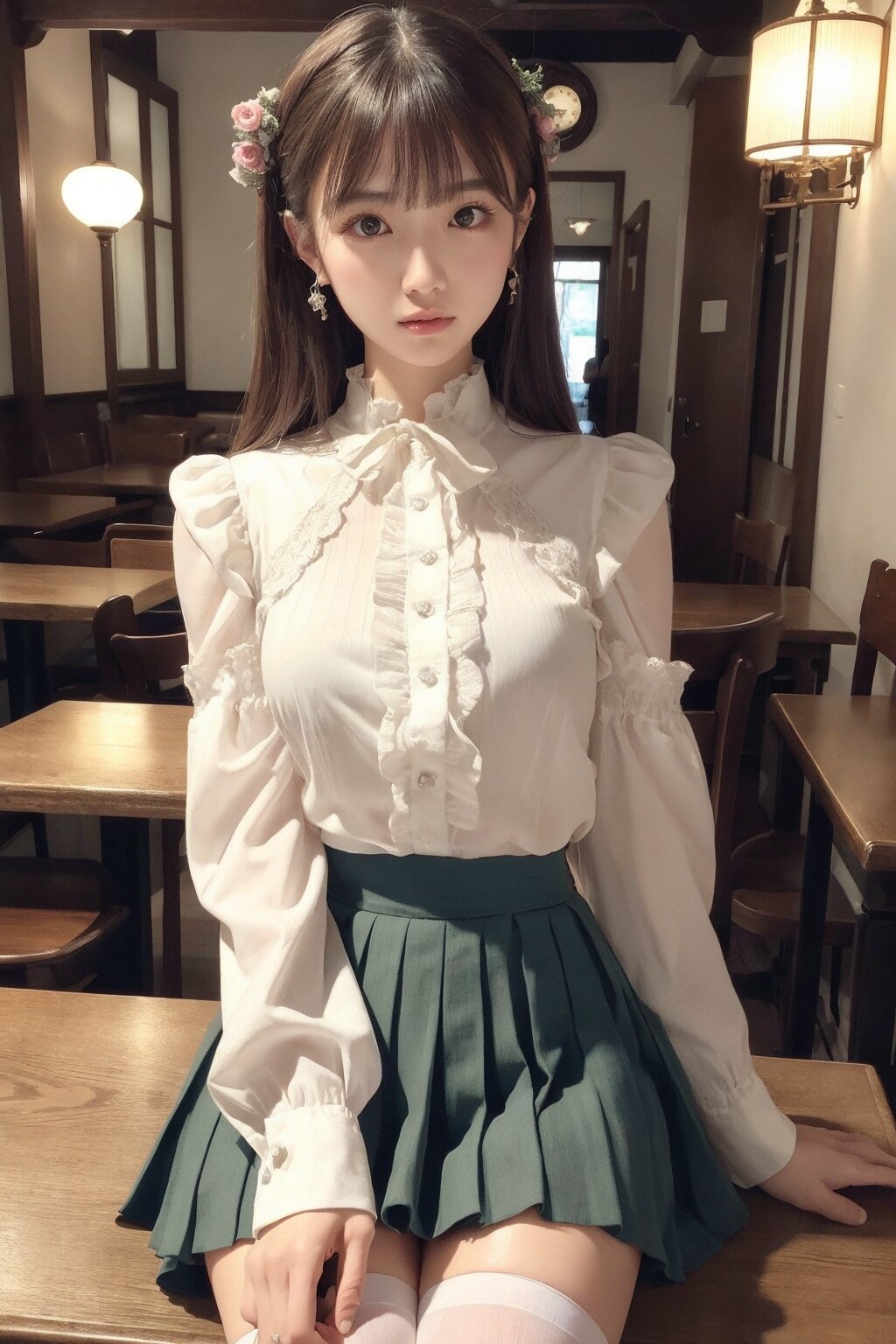 masterpiece, RAW photo, hyper detailed, 16K, extremely detailed CG, Japanese woman, 23yo, ((solo)), cute, pretty, hyper detailed eye, hyper detailed face, medium hair, bangs, extremely detailed, thin, tall, perfect anatomy, good proportion, extremely detailed body, perfect proportion, Pleated Skirts, High Socks, Sneakers, sitting chair, in cafe, old fashioned, antique, extremely detailed blouse and skirt, hyper detailed background,