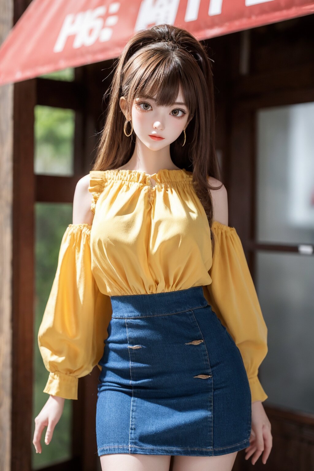 masterpiece, RAW photo, hyper detailed, 16K, extremely detailed CG, Japanese woman, 23yo, ((solo)), cute, pretty, hyper detailed eye, hyper detailed face, medium hair, bangs, extremely detailed, thin, tall, perfect anatomy, good proportion, extremely detailed body, perfect proportion, blouse,short skirt, extremely detailed blouse and skirt, hyper detailed background,