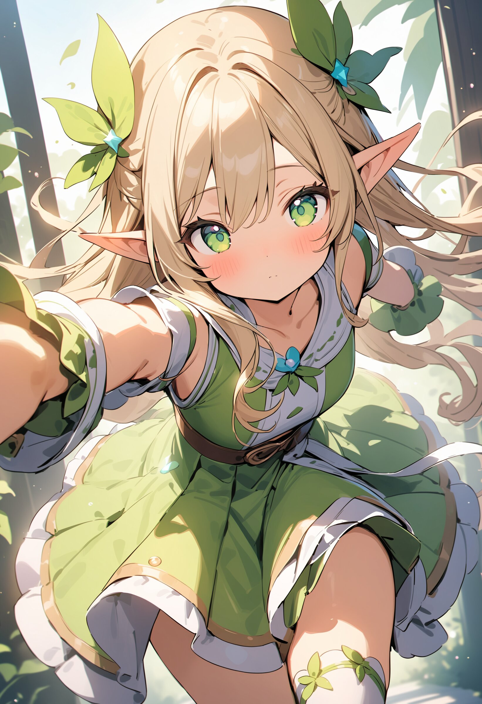 ((masterpiece)), ((best quality)), ((kawaii)), cute, (lovely), ((extremely detailed)), (beautiful), dynamic angle, a cute girl, 1girl, solo, ((elf)),beautiful blond hair, beautiful green eyes, ((beautiful eyes)), long hair, fantasy clothes,