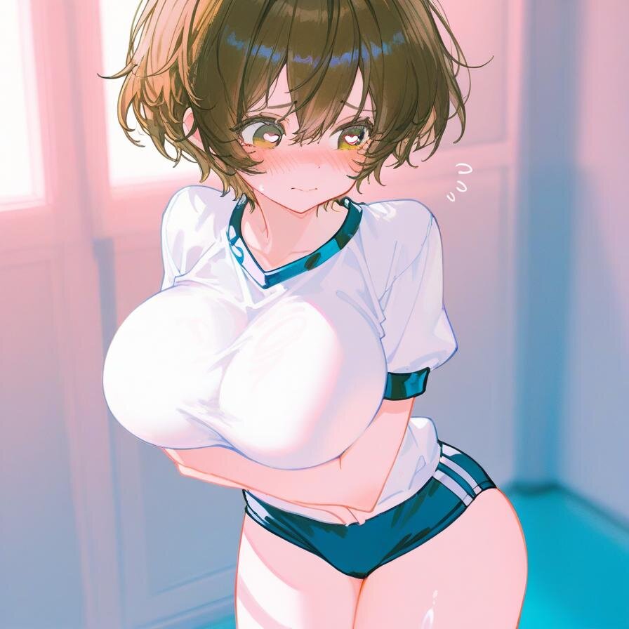1girl,kawaii,bishoujo,early teen,shiny_skin,glamor,round face,brown hair,short hair,brown eyes,heart-shaped eyes,bright_pupils,small nose,puffy lips,huge breasts,slender_waist,