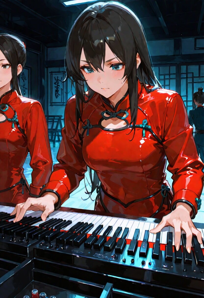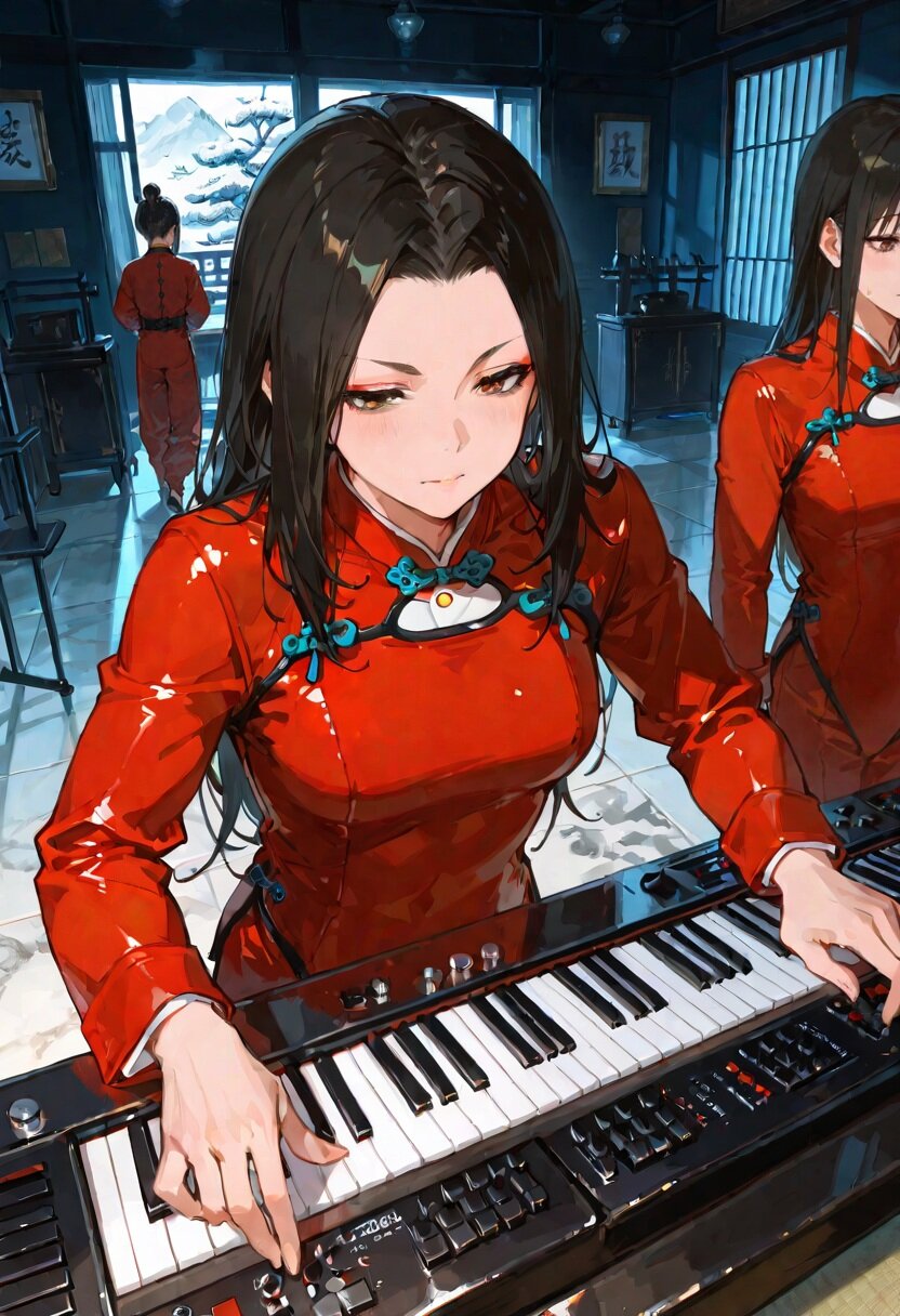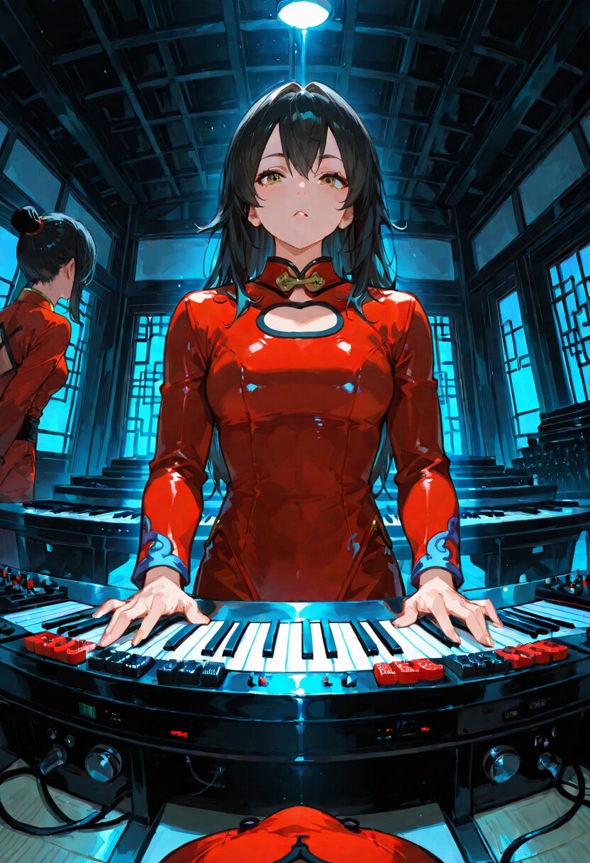 1 Japanese woman, 25 years old, fair skin, solo focus,beauty: 1.7, (mao suit, red clothes: 2.0),black hair, long hair, indoors, studio, dark room ,analog synthesizers,many keyboards, BREAK Top quality, (8k, best quality, masterpiece, ultra high res, ultra-detailed:1.3),((detailed skin)), RAW photo,detailed background,