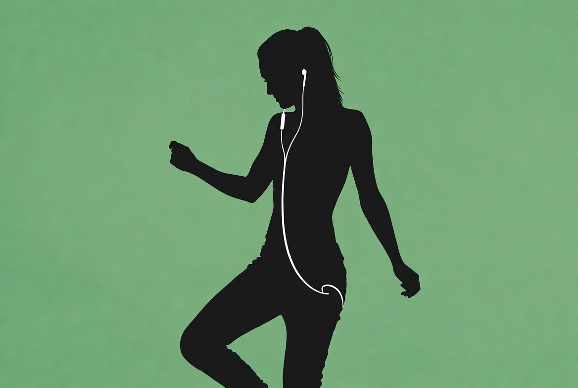20歳の女性のデジタルイラスト、カジュアルな服装で踊っている姿、黒いシルエット、白いイヤホンとポケットまで続くケーブルが目立つ、白いイヤホンのケーブルが強調されている、グリーン一色の背景