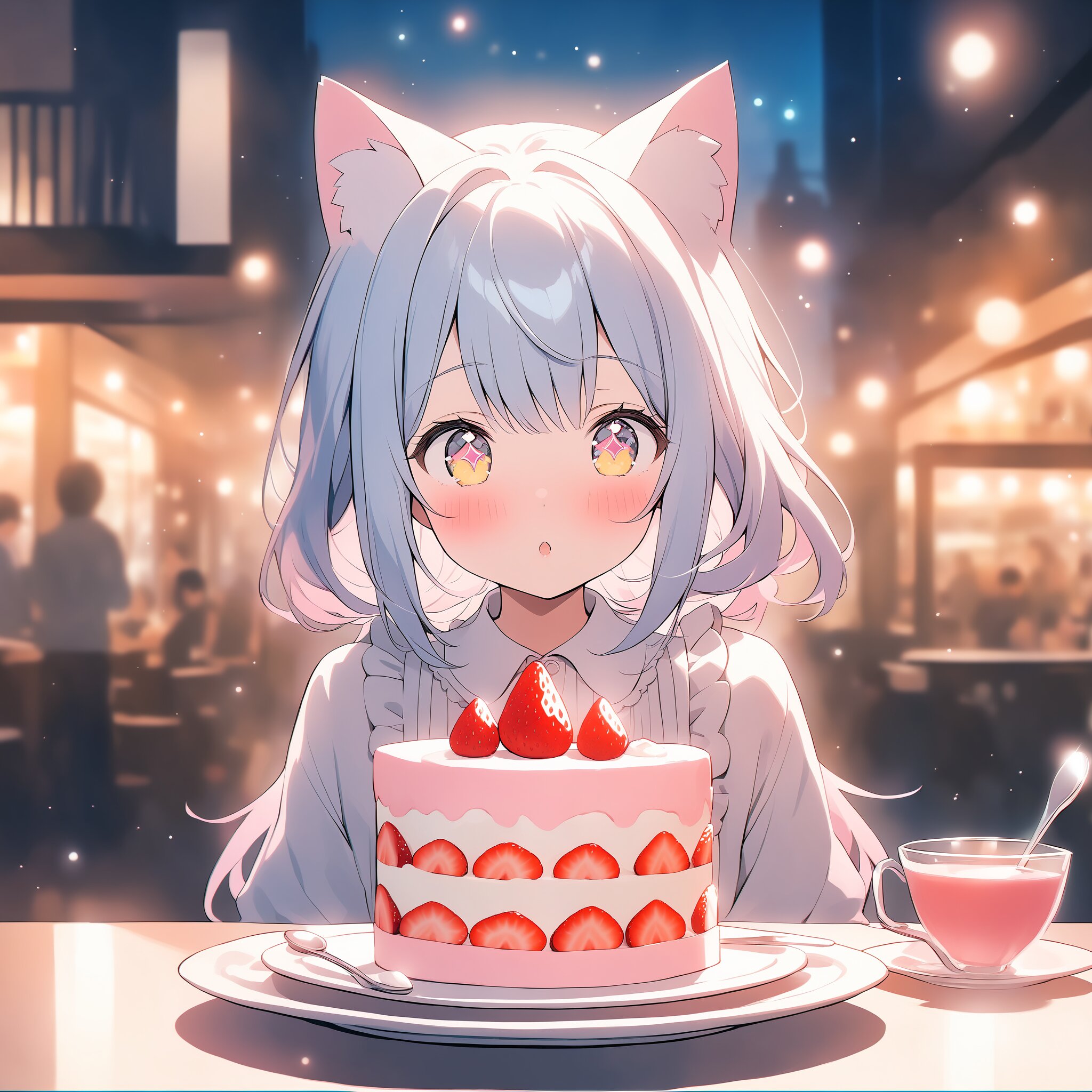 An adorable cat-eared girl in a pastel-colored cafe, wearing a frilly white dress with pink ribbons, large sparkling eyes filled with joy, fluffy white cat ears with pink insides, she is about to eat a delicious strawberry shortcake with a small silver spoon, soft blush on her cheeks, bright and dreamy atmosphere, soft bokeh background, high quality, anime style, cinematic lighting, masterpiece.