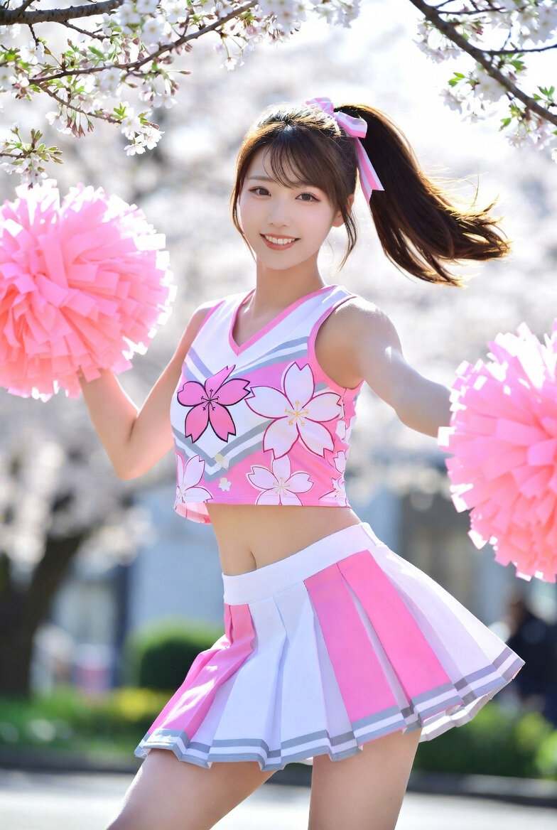 日本人女性18歳のチアリーダーのリアルなフォト。桜をモチーフにしたユニフォームを着ている。ポンポンを両手にもっている。背景は春の屋外。みんなを元気づけるポーズ。