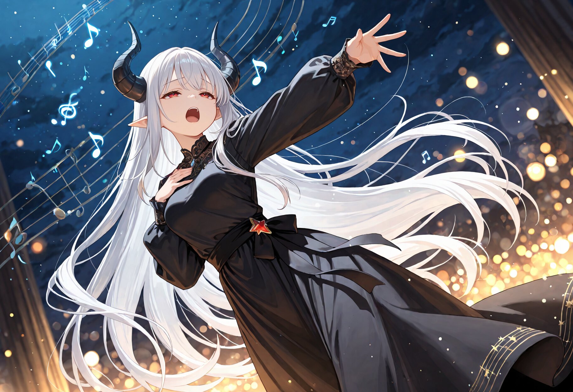 masterpiece,best quality,highres,ultra detailed,highly detailed,8k,general,1girl,solo,17yo,cute,thick arms,(black dragon horns,demon horns,silver hair, very long hair,bangs, red eyes),slender,long sleeves that cover wrists,medium breasts,dragon girl,dragon ears,pointy ears,sad,half-closed eyes,open mouth,screaming,(princess dress,very long dress,black dress,black sash),slender girl,wind,spread arm,hand on chest,looking up,musical note,bokeh,light particles,fantasy,dutch angle,night,star