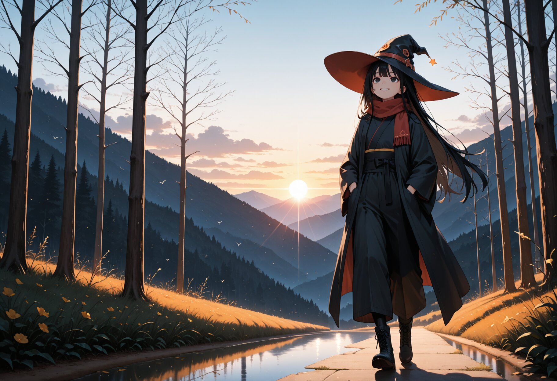masterpiece,best quality,highres,highly detailed,detailed eyes,general,1girl,solo,17yo,(hands in pockets, black witch hat,long red scarf,grin),cute girl,slender,small breasts,very long sleeves,light smile,black hair,long hair,bangs,black eyes,Witch girl,(long black Witch cloak,long black Witch kimono robe, black obi,long black cargo pants),boots,slender girl,morning,sunrise,plain,nature,walking,full body,looking up,fantasy,