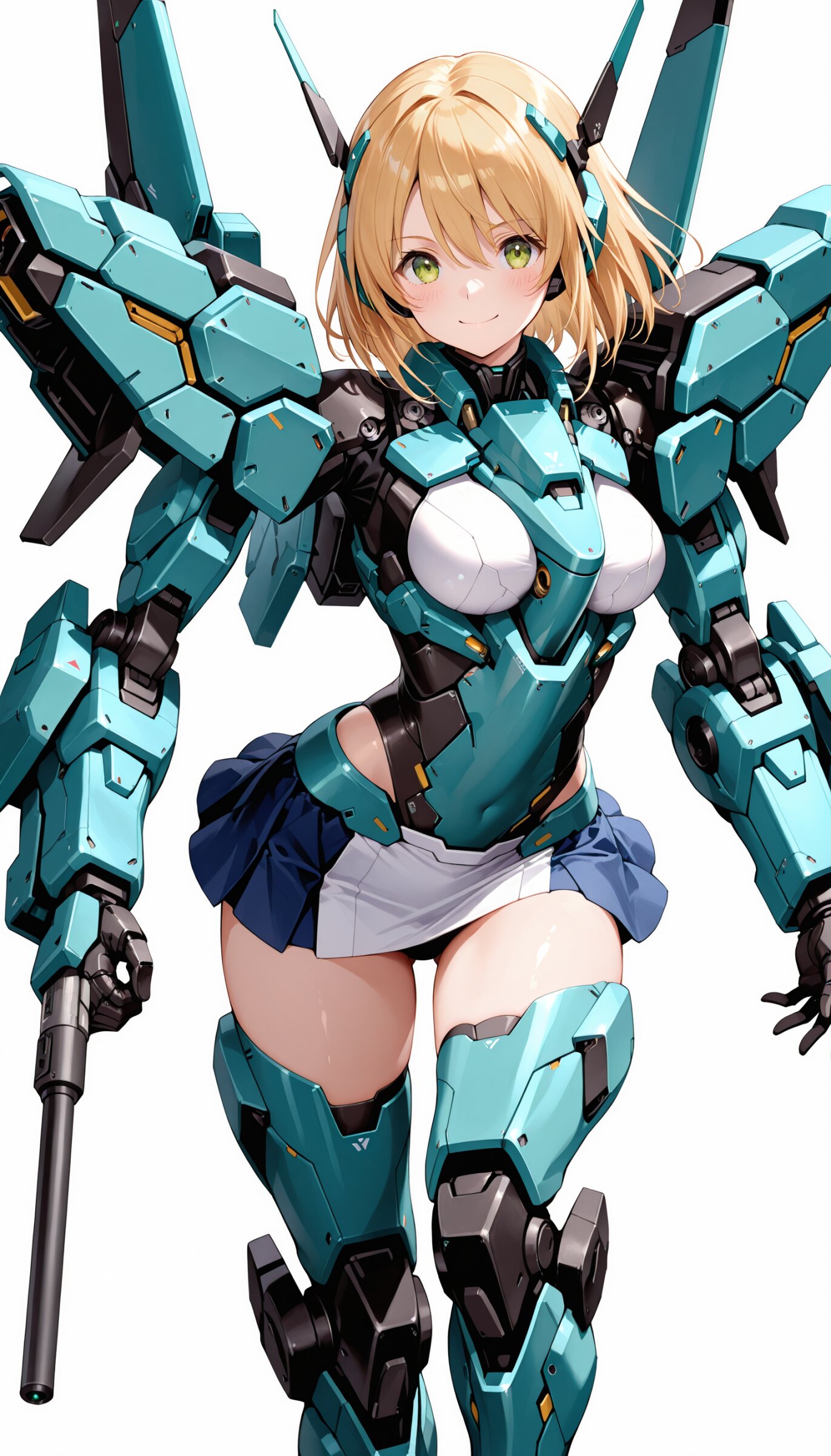 1girl, ((white background)), ultra detailed 8k cg render, masterpiece, high resolution, extremely detailed, mecha musume,mecha shoulder, mech leg, headgear, mecha armor, ((mini skirt)),long blonde hair, dropping green eyes, smile, dynamic posing,