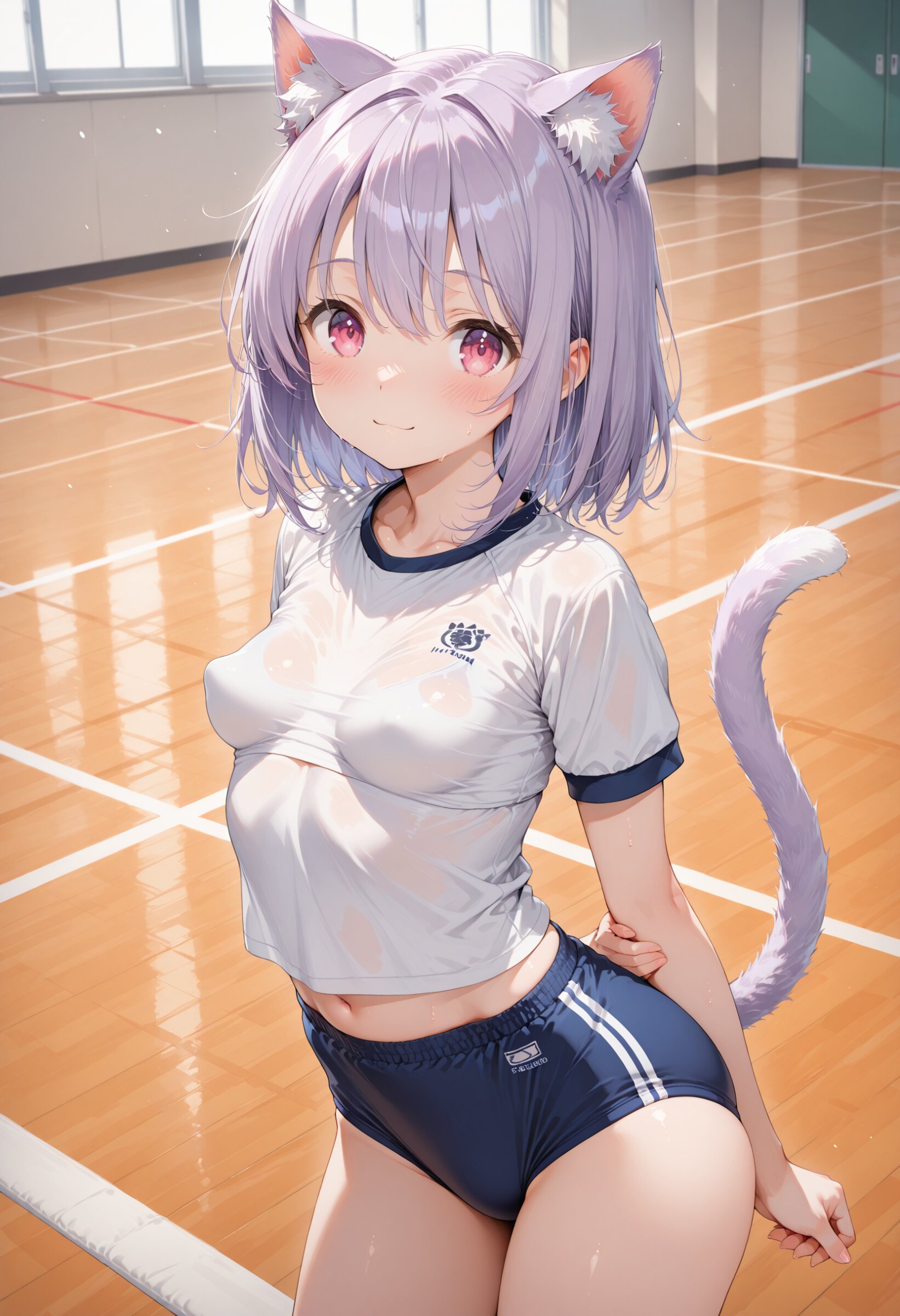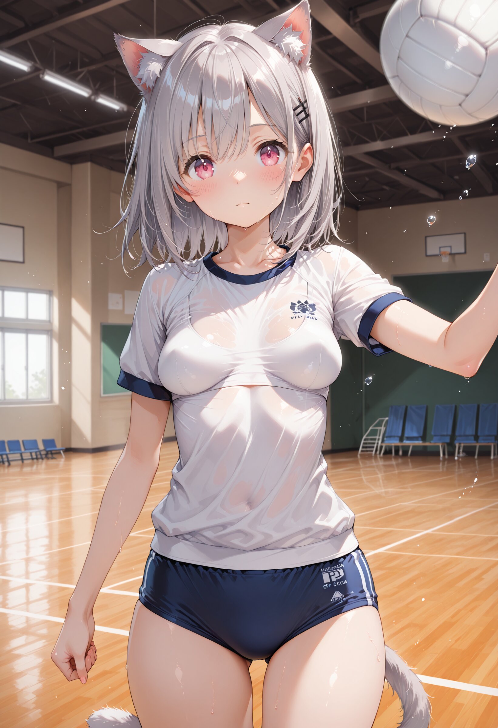 masterpiece, best quality, highres, ultra-detailed, extremely detailed, detailed, 1girl, loli, (petite:1.2), (school PE t-shirt:1.4), cat ears, cat tail, silver hair, pink eyes, medium hair, buruma, (sports bra1.2), medium breasts, (perky breasts:1.2), impossible clothes, school gym, innocent expression, look at viewer, playing volleyball , dynamic pose,