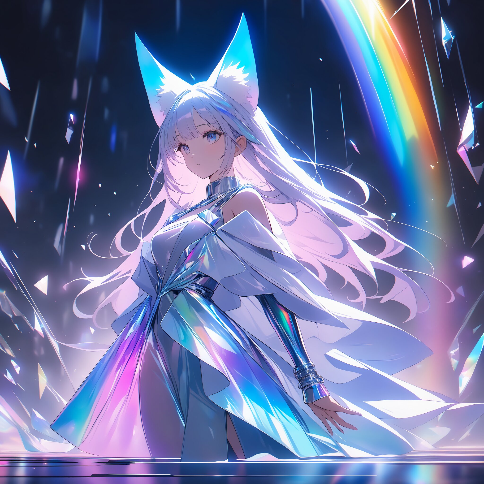 A surreal cat-eared girl whose ears are made of translucent glowing crystals, refracting rainbow light like a prism, her hair is silver and metallic, shards of floating glass around her, wearing a sleek iridescent dress, futuristic and mineral aesthetic, sharp focus on the crystalline texture, cinematic lighting, masterpiece, 4k, ethereal and cold atmosphere.