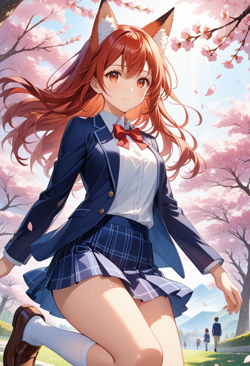 (high resolusion,illustration,ultra detailed 8k art,extremely detailed CG,official art,clothes reflecting light,detailed shiny skin,detailed background:1.3), ((highly detailed beautiful face and eyes),anime_style, red_fox_ears, fox_girl, red_hair, long_hair, delicate_facial_features, double_eyelids, long_eyelashes, red_eyes, star_in_eyes, anime_eye_focus, navy_blazer, red_ribbon_on_chest, checkered_miniskirt, high_school_student, socks, loafers, cherry_blossom_trees, falling_sakura_petals, soft_spring_lighting, clean_lineart, gentle_breeze_effect, detailed_clothing