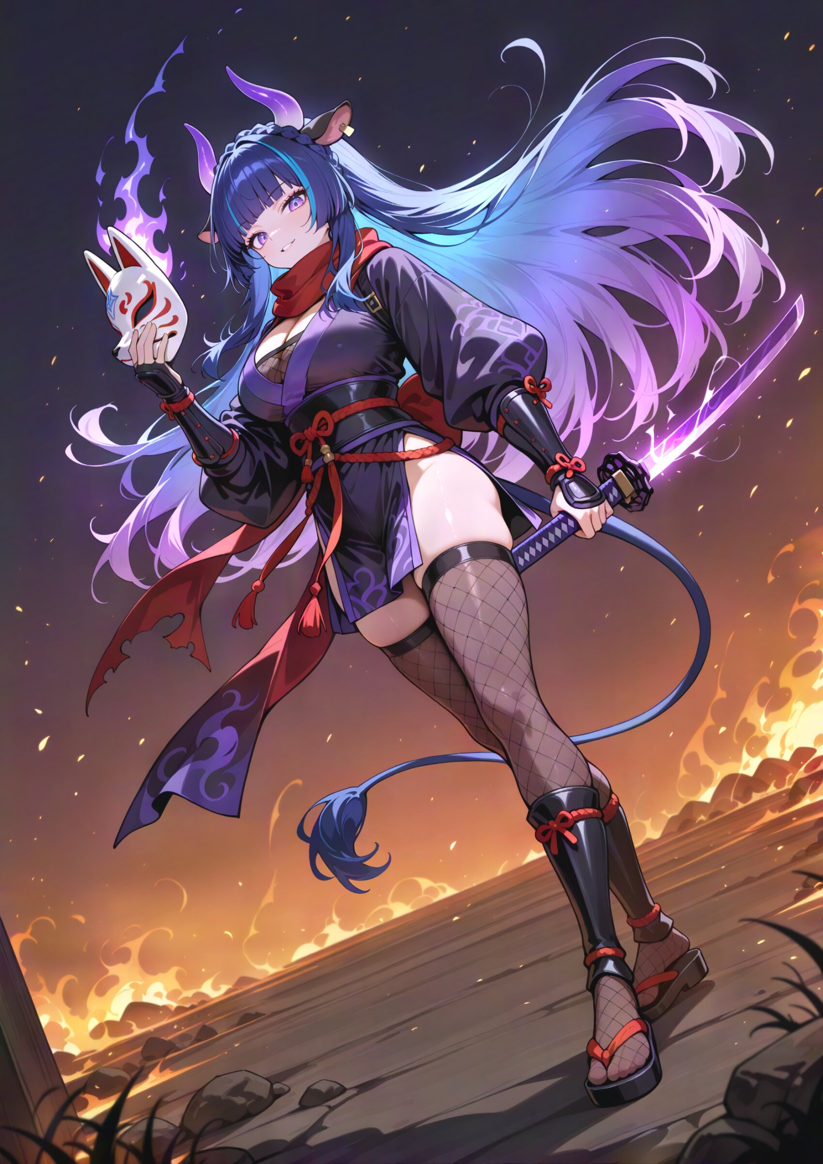 from side, (face:1.15) from below, looking down looking at viewer, (dutch angle:1.2), weapon focus winter atmosphere, earthy color, glowing warm colored purple cow energy, warm colored purple silhouette of serious cow guardian, huge cow aura, 1girl, ninja, (muscular female:0.65), cobalt blue hair, maroon streaked hair, highlights hair, extra long hair, crown braid blunt bangs , , unworn eyewear, aqua-framed eyewear, beautiful celadon eyes long cleavage long breasts, ,gigantic breasts, huge breasts, ninja cloth, short kimono, obijime, fishnet inner, fishnets, fishnet thighhighs, pelvic curtain,, kote, (ninjutsu:1.1), (holding scroll:1.1) fox mask, holding fox mask, unworn mask,, , red scarf, zouri, , cow ears, cow tail, ,, japanese clothes, seductive smile, dynamic pose, kung fu attack, kung fu action, kuji-in, ninjutsu, reverse grip, katon, fire, embers, cremate, boilover, (swirling ink effects:1.2) fleeing, beautiful metallic luster, sharp katana, ultra detailed warm colored purple katana, silver particles, light trail, The background is a solid, bright warm colored purple, creating a striking contrast with the intricate, multi-colored design of the character, (standing silhouette:0.0), pop color background, (high saturation:1.2), drop shadow, ink-drenched shadows, solid black shadow blocks, abstract ink swath background, heavy chiaroscuro, high-contrast inky shading, negative space, grunge texture, calligraphic strokes, super fine concept art, hard surface, graceful eyes, masterpiece, best quality, amazing quality, very aesthetic, absurdres, newest, professional art lots of details, , overexposure, sumie effect style, 4ur4_illu,shiny, glowing, glowing particles, glowing light particles, light particles, arc flash, <lora:noline (1):-0.5> <lora:sdxl2-flat2-512b:0.2> <lora:facelightup_xl_v10:0.5> <lora:V2_yakumo_alchemy:0.5> <lora:Aura_illu:0.1>