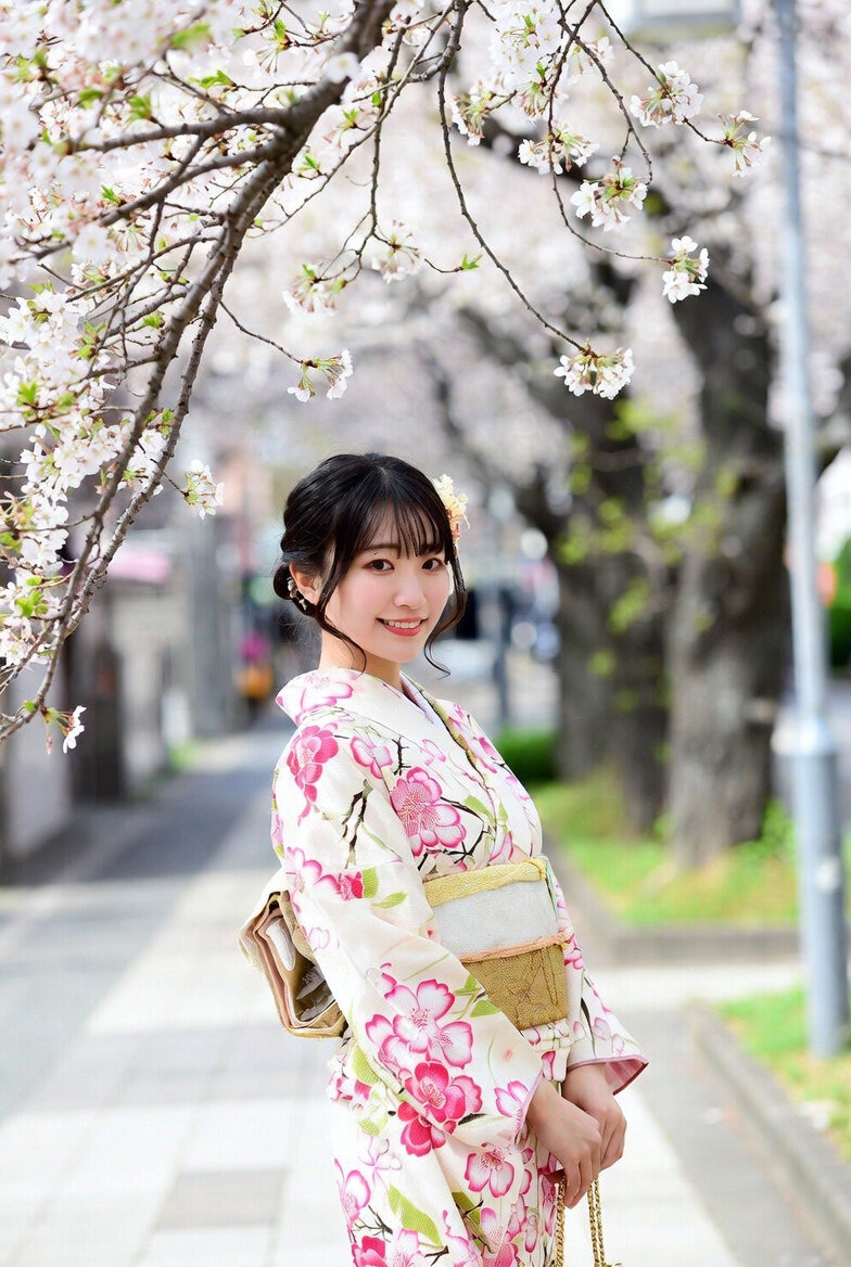 桜と和装。ファッションモデルによる商品紹介風。