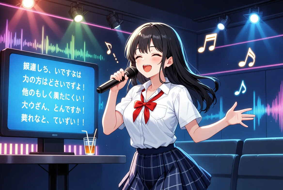 カラオケルームで元気に歌う可愛い女子高生のデジタルイラスト。黒髪ロングヘア、制服(白い半袖ブラウス、赤いリボン、紺のチェック柄プリーツスカート、)、マイクを片手で握って目を閉じて笑顔で熱唱、幸せそうな表情、カラオケの大型モニターにカラオケ歌詞が映っている、歌詞は日本語、背景にカラフルなLED照明と音符エフェクト、ネオン風のカラフルな光が部屋中に広がっている、ドリンク1杯とストロー付きグラス1個がテーブルに、非常に詳細、鮮やかでポップな色彩。