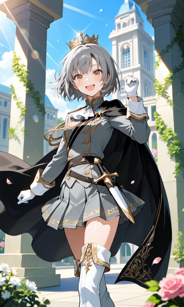 A 19-year-old girl with short, shaggy gray hair and warm brown eyes stands proudly in a grand palace courtyard, wearing an exquisitely detailed (Grey luxurious Prince costume:1.6) with elaborate gold embroidery. Her outfit features (luxurious Black Cape:1.3) billowing dramatically behind her, a (luxurious Grey mini skirt:1.4) with delicate pleats, and (luxurious White Boots:1.3) that reach her thighs. She wears (luxurious White gloves:1.3) and has a (dagger on waist:1.3) in an ornate sheath. A (luxurious crown:1.4) rests atop her head, glinting in the afternoon sunlight. She beams with a cheerful, happy smile, looking directly at the viewer with sparkling eyes and a slightly flushed, delicate face. The brutalist architecture of the palace surrounds her, its stark geometric lines softened by climbing ivy and blooming flowers. Sunbeams filter through the columns, creating lens flares that highlight her radiant expression. The romantic academia atmosphere blends with classic academic elements, creating a timeless, storybook quality. Every detail - from the intricate stitching on her gloves to the individual strands of her windswept hair - is rendered with insanely detailed precision, making this a true masterpiece of 16k quality.