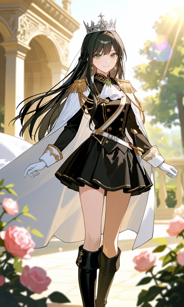 A stunning young woman with long, straight black hair and striking green eyes stands confidently in a palace courtyard, dressed in a (Black luxurious Prince costume:1.6) with intricate gold embroidery. She wears a (luxurious White Cape:1.3) that billows elegantly behind her, paired with a (luxurious Black mini skirt:1.4) and (luxurious Black Boots:1.3) that reach her knees. Her (luxurious White gloves:1.3) contrast beautifully with her attire, and a (dagger on waist:1.3) adds a touch of danger to her regal appearance. A (luxurious crown on head:1.4) glimmers in the sunlight, emphasizing her noble bearing. She gazes directly at the viewer with a happy, calm smile, her delicate face radiating charm and confidence. The background features Rococo architecture with ornate details, surrounded by blooming flowers in the afternoon (sunlight). Sunbeams filter through the trees, creating a soft lens flare effect that enhances the romantic, academic atmosphere. Her pose is both cute and poised, embodying a perfect blend of elegance and youthful energy. The image is rendered in insanely detailed 16K quality, with particular attention to the textures of her costume, the play of light on her smooth skin, and the delicate strands of her hair.