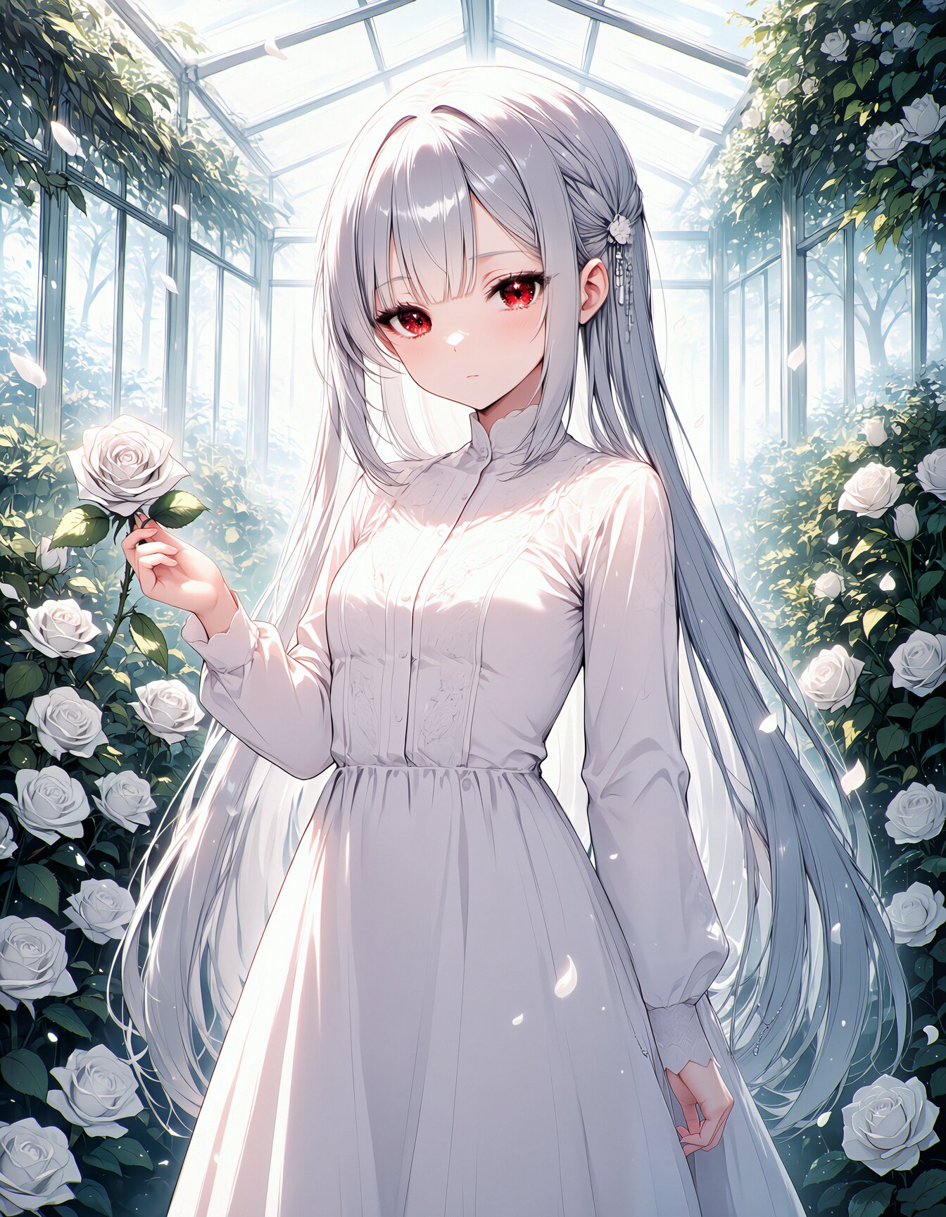 masterpiece, best quality, newest, safe, 1girl, solo, kochou, A medium shot of a petite girl with long straight silver white hair and neat bangs standing inside a sunlit glass greenhouse surrounded by white roses in full bloom. She wears an elegant pure white lace dress with long sleeves and a high collar, small side braids adorned with tiny white flower pins. Her deep crimson eyes gaze calmly at the viewer with a dignified expression, one hand gently touching a white rose beside her. Soft diffused light filters through the glass ceiling, creating an ethereal glow around her silver hair. White rose petals drift in the air. The greenhouse is filled with lush green foliage contrasting against the pure white blooms. Delicate morning dew glistens on the petals.