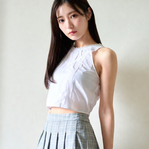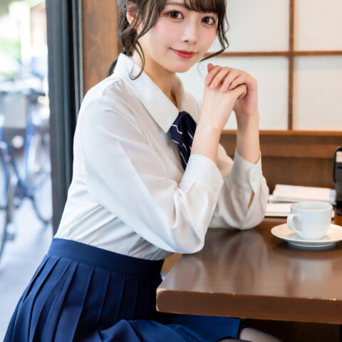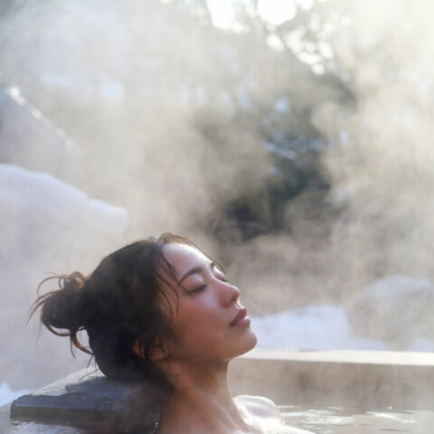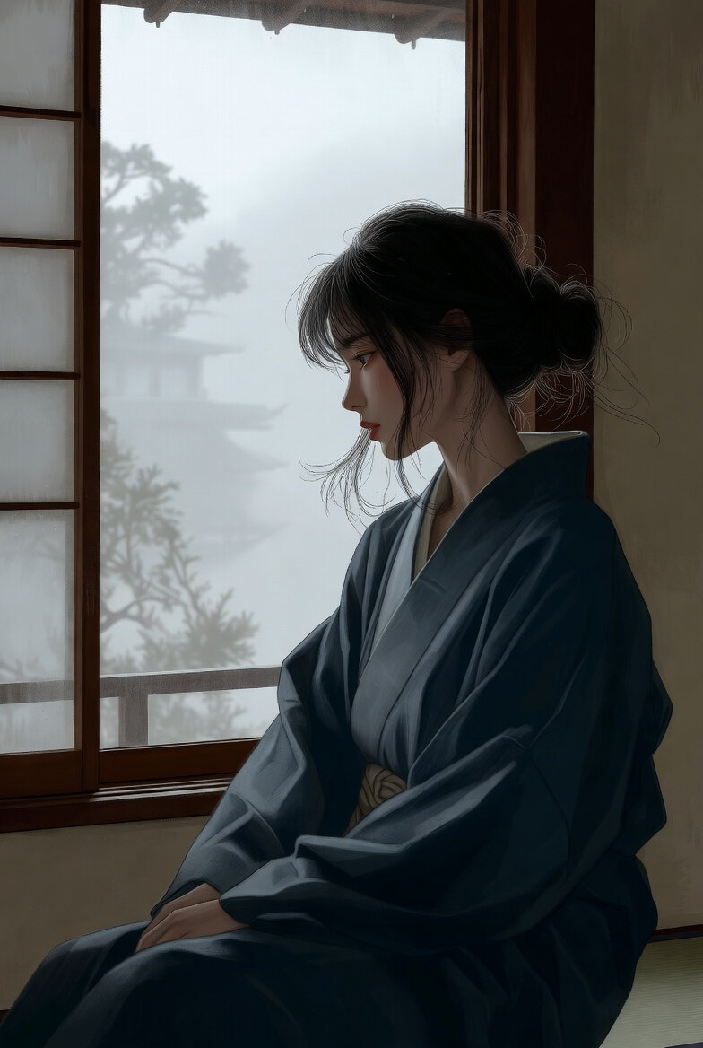 日本人女性25歳のデジタルイラスト。冬の部屋着。日本の温泉旅館の部屋から外の景色を眺めている。朝の霞の影響で多くが白い靄の中。