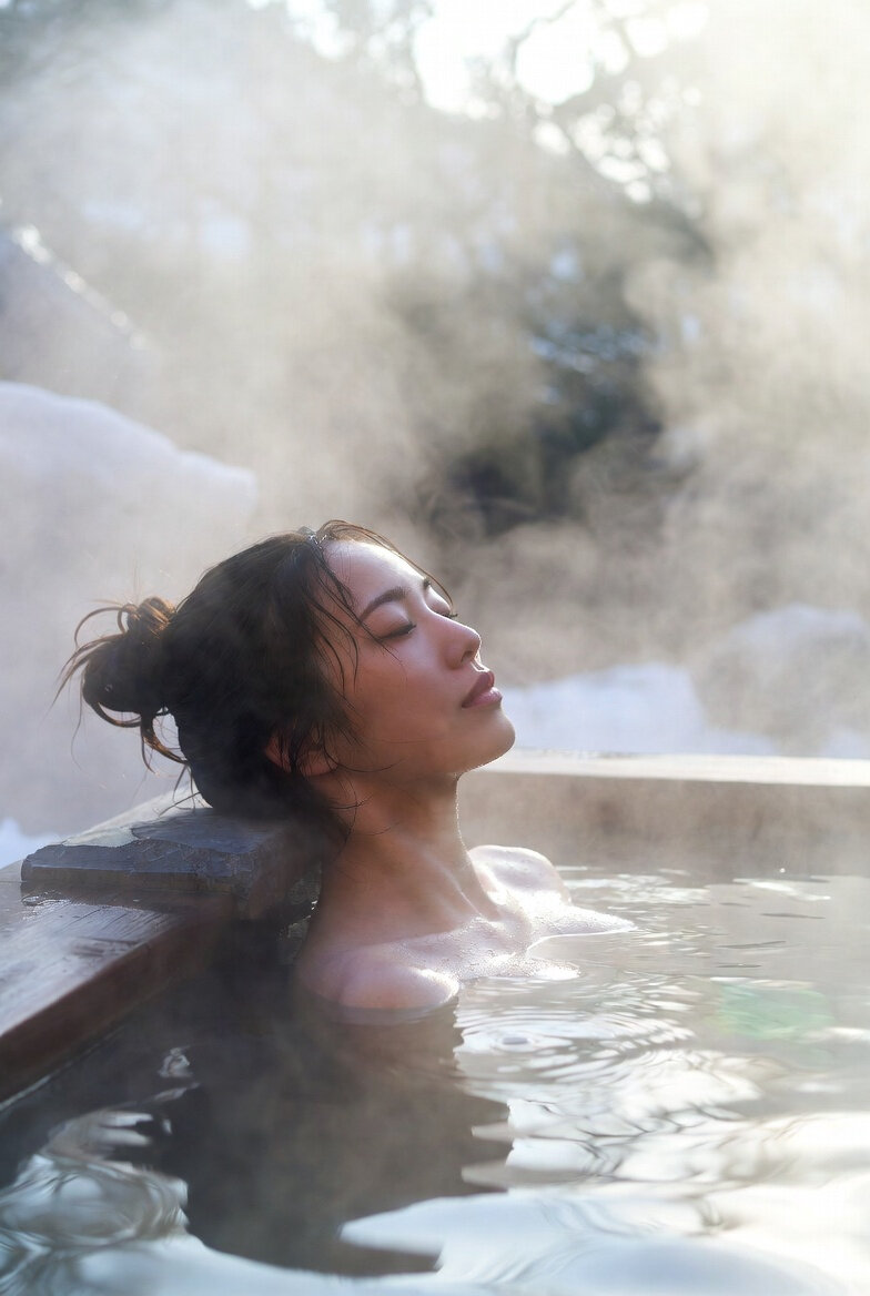 日本人女性25歳のリアルなフォト。冬の日本の露天風呂に入っている。朝の霞の影響で多くが白い靄の中。