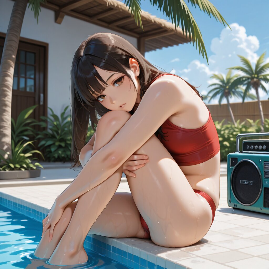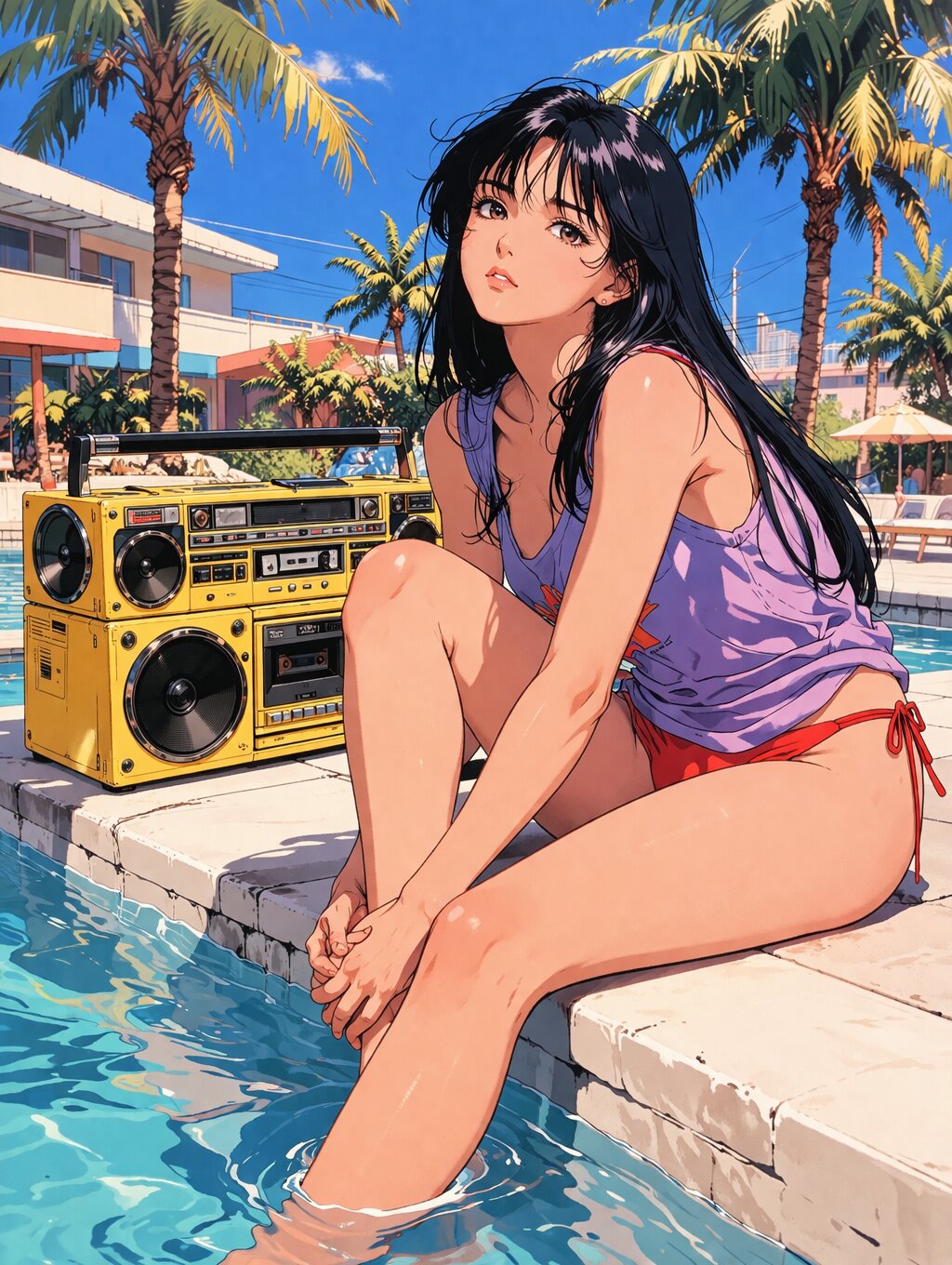 An 80s-style anime illustration of a young woman with long black hair sitting on the edge of a swimming pool. She is sitting with her left knee tucked up, holding her ankle with both hands, while her right leg is dipped in the pool water. She is looking directly at the camera with an expressionless, slightly upward gaze. She is wearing a purple tank top and red bikini bottoms. A bright yellow double-deck boombox is placed diagonally on the ground next to her right hip. The background shows a sunny poolside scene with palm trees and a resort-style building under a clear blue sky, capturing a nostalgic city pop aesthetic.
