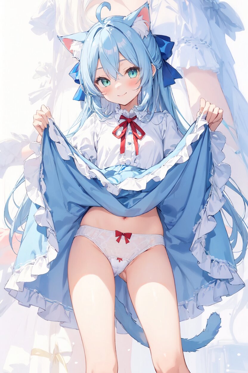 The image shows an animated girl with blue hair wearing a white and blue dress, holding a blue scarf in her hand. The background is blurred, giving the image a dreamy, ethereal feel. 1girl, solo, long hair, looking at viewer, smile, blush, shirt, green eyes, skirt, closed mouth, hair between eyes, cat ears, bow, ribbon, white shirt, standing, blue hair, tail, underwear, ahoge, panties, hair bow, frills, cat ears, red bow, cat ear fluff, clothes lift, red ribbon, blue skirt, belly button, white panties, feet out of frame, cat tail, neck ribbon, blurry background, blue bow, frilled dress, cat girl, ass visible through thighs, frilled skirt, skirt lift, bow panties, blue tail