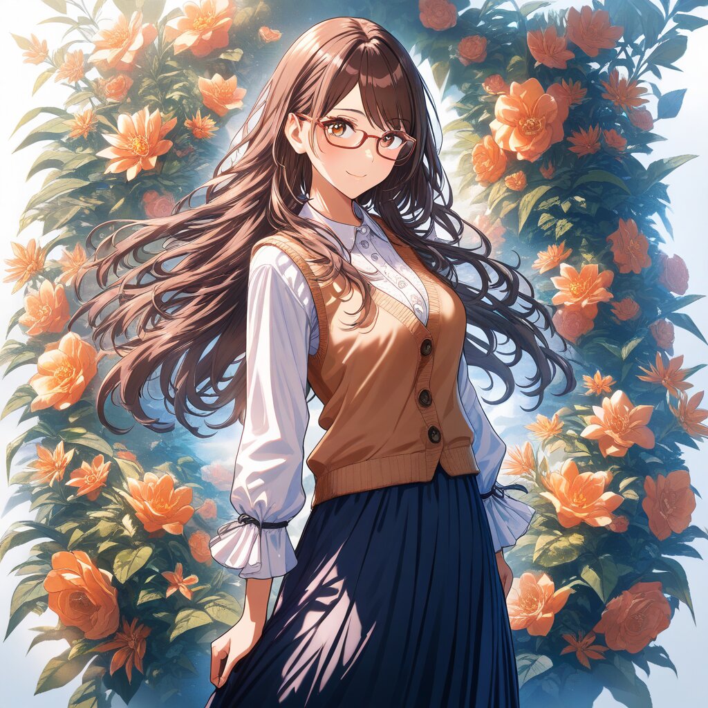 masterpiece, best quality, ultra detailed, 1girl, delightful, smiling, long hair, dark brown hair, brown eyes, fair skin, tall, slim, medium breasts, glasses, blouse, cardigan vest, long skirt, black tights, boots