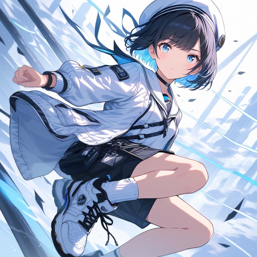 masterpiece, best quality, ultra detailed, 1girl, (black short hair:1.5), silver inner hair, light blue eyes, small breasts, slender, short, white serafuku, white sailor hat, white jacket, white sneakers, white socks(three light blue line), black choker,