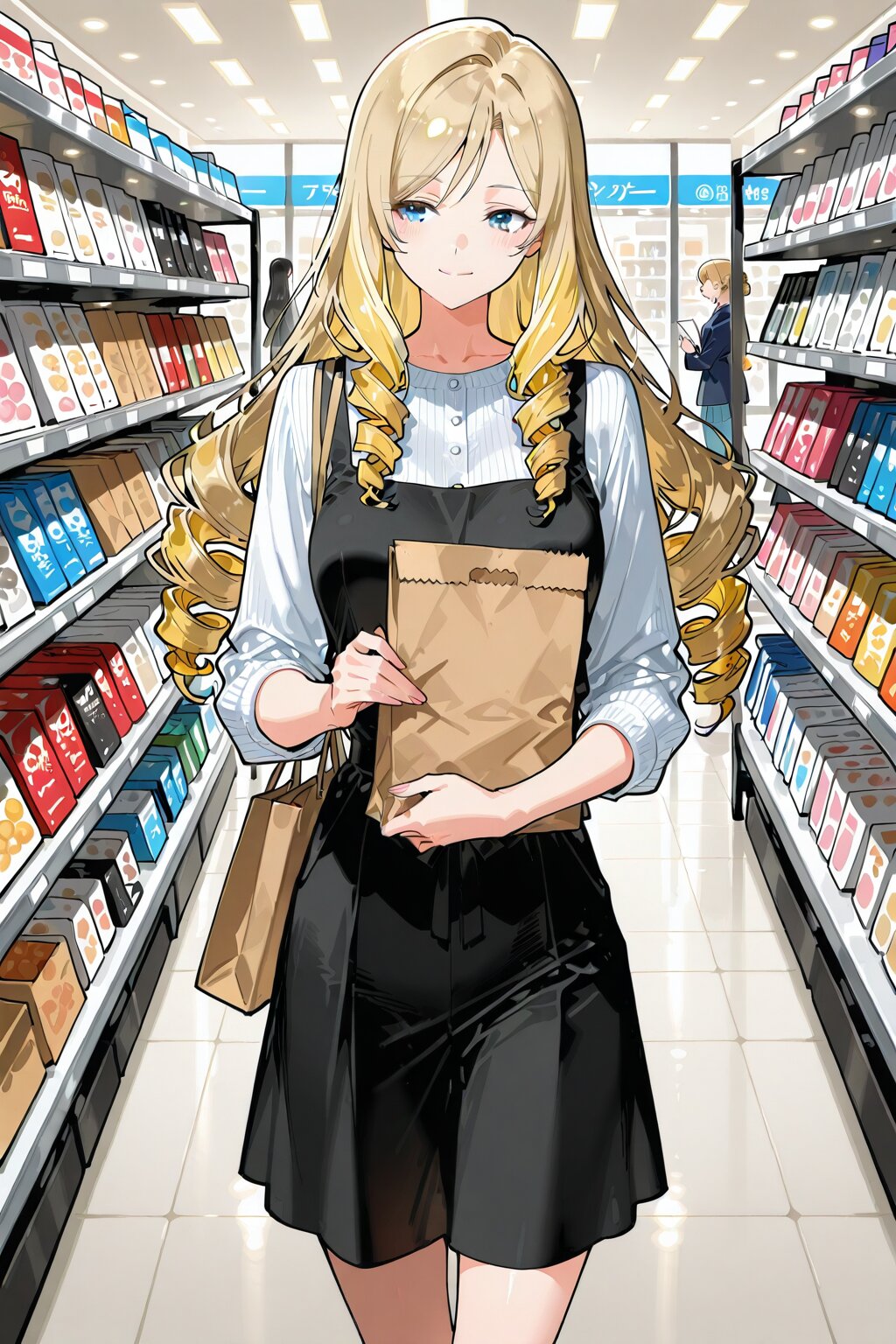, 1 lady, ,blonde hair, drill hair, long hair, twin drills,((shopping, holding many paper bags)), walking, smile