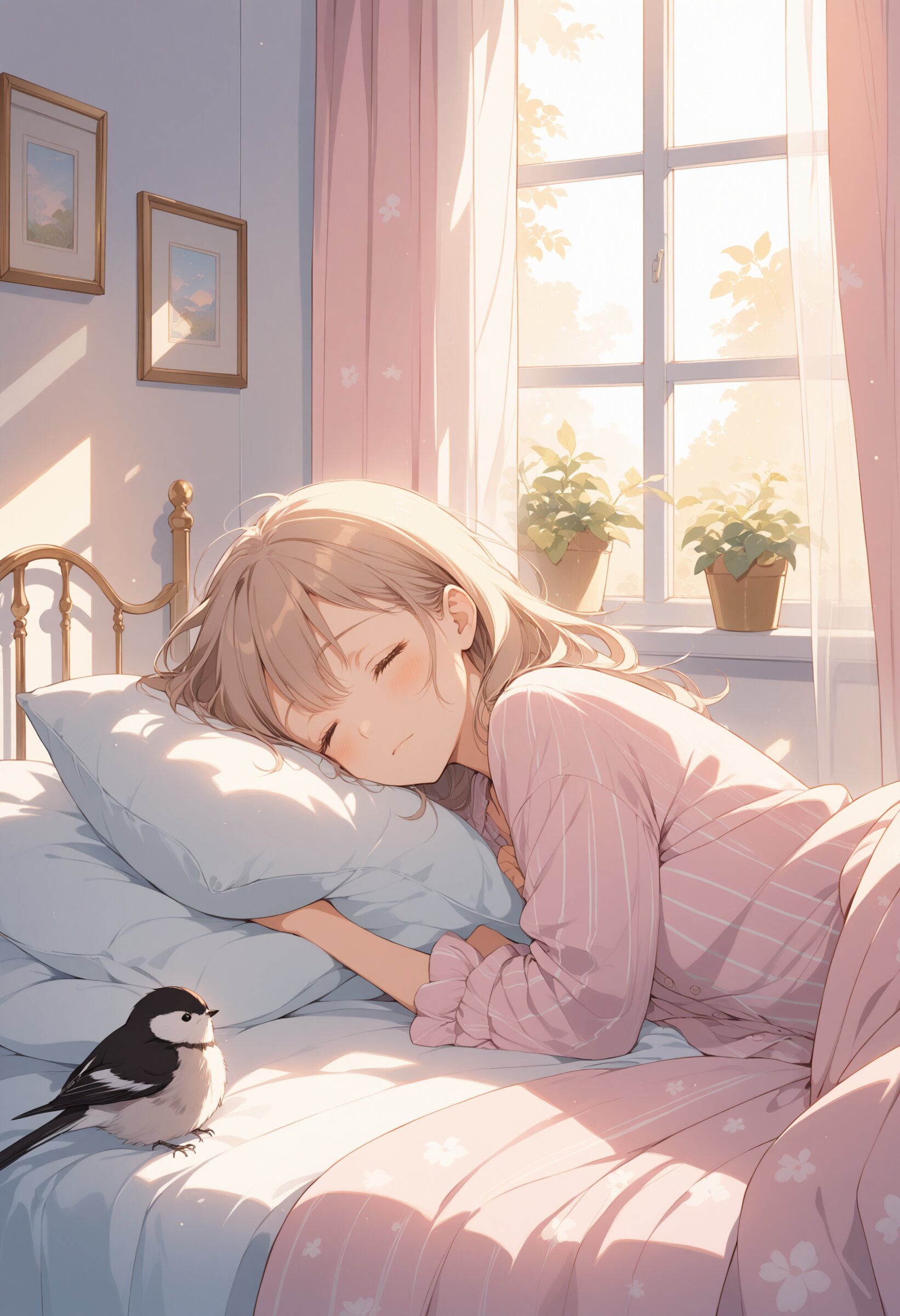 Best quality, Masterpieces, An illustration-style image of a girl sleeping in her room wearing pajamas, illuminated by the morning sunlight streaming through the window. A small fluffy Shima Enaga (long-tailed tit) bird is perched on top of her body, gently waking her up. The girl has one eye half-open and one eye still closed, with a drowsy sleepy expression. Soft warm golden morning light filters through sheer curtains. Cozy bedroom interior with pastel colors. Anime illustration style, soft cel shading, dreamy and gentle atmosphere, high quality digital art