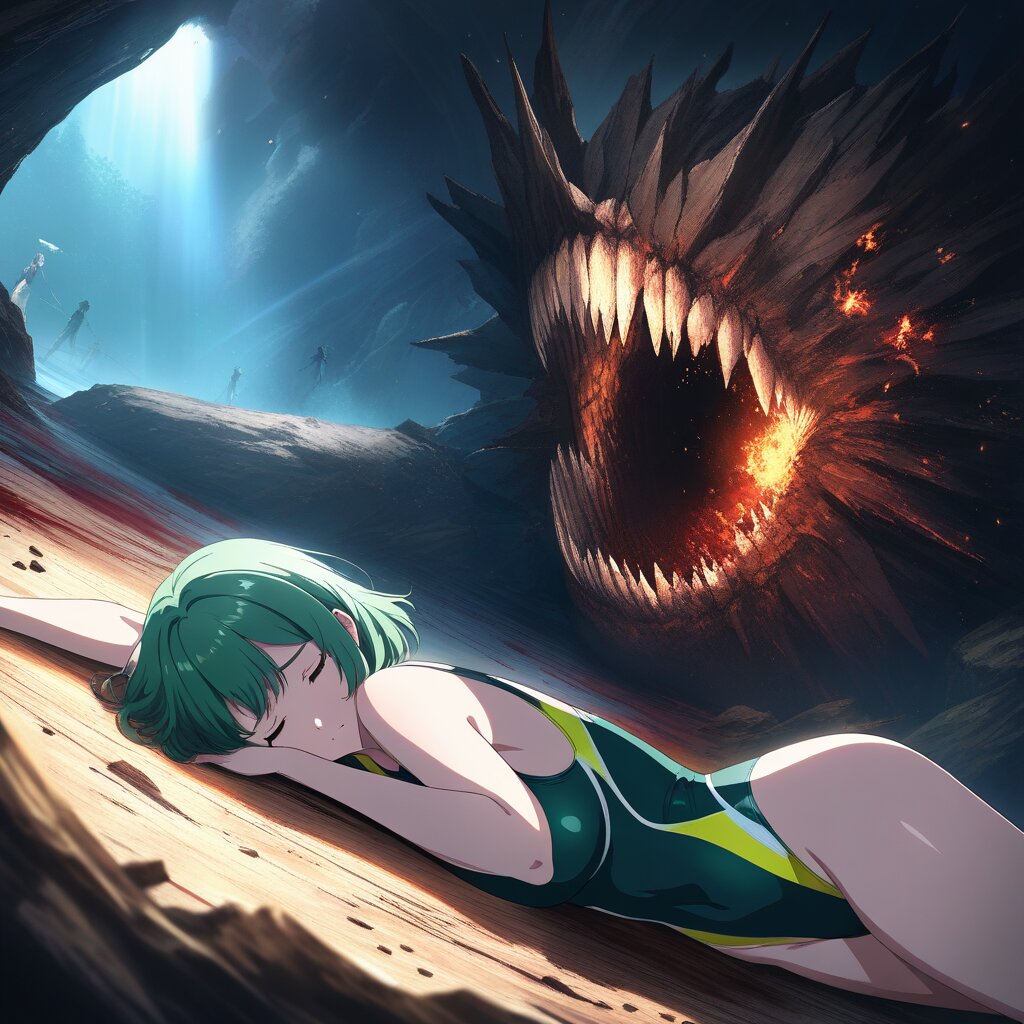 ((masterpiece)), ((best quality)), (ultra-detailed), anime style,cowboy shot, Dark underground cave,(green competition swimsuit),a cute girl,large bust, short hair, green hair, ((closed eyes)), ((lying on side)) ,horrified,painful face,bloody her body, Staff that fell to the ground,from behind,oversized animal,zombie