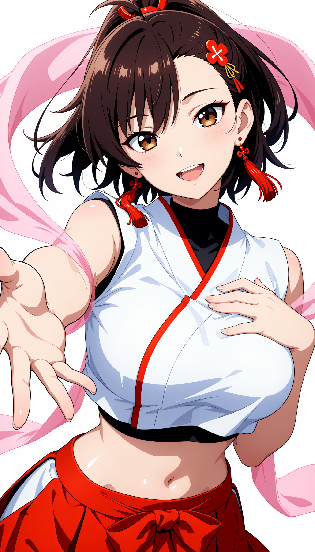 <lora:MeMax6-noob-vpred:1>,memaxl6_a,memaxl6_b,memaxl6_c,memaxl6_d,memaxl6_e, Full HD,32K, 1girl, solo, pink hagoromo:1.6, shiny skin, standing, portrait, (smile, hand on own chest, reaching at viewer), open mouth, looking at viewer, head tilt, (teenage), (large breast), (slender):1.2, (tsurime):1.2, beautiful hair, shiny hair, dark-brown hair, (asymmetrical bangs:1.2), (high ponytail, short ponytail):1.1, ahoge, (brown eyes:1.2), (sleeveless, japanese clothes:1.6, hair ornament, crop top, navel, midriff-baring outfit, white‑red miko, red short skirt, , tassel earrings, black undershirt), (simple background, white background), masterpiece, best quality, super fine illustration, very aesthetic, newest, hyper detailed, intricate, beautiful, aesthetic, highly decorative, HDR, yume kawaii, ,anime screencap,anime,no gradients, 2D flat design, bold outlines, 10's anime style,