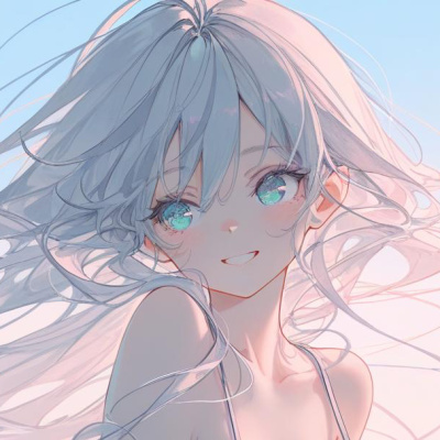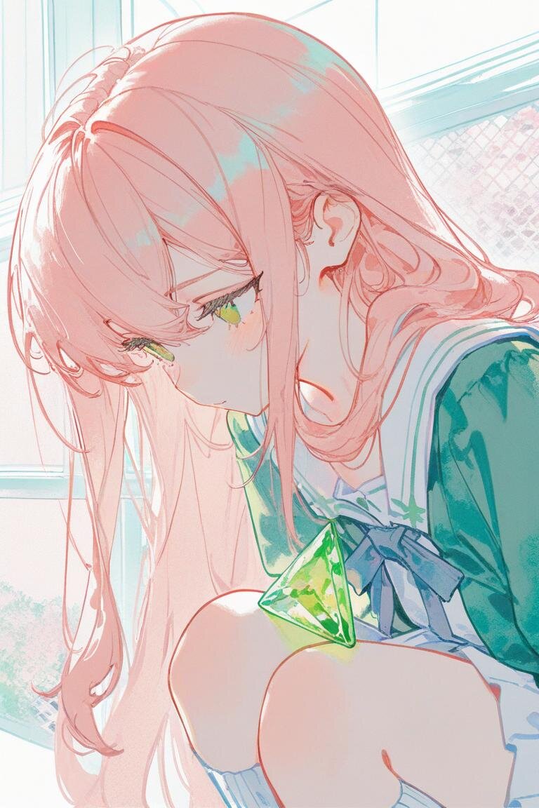 A young shy Japanese girl with soft pale pink wavy semi-long hair hanging over her face and expressive emerald green eyes shining with calm joy.