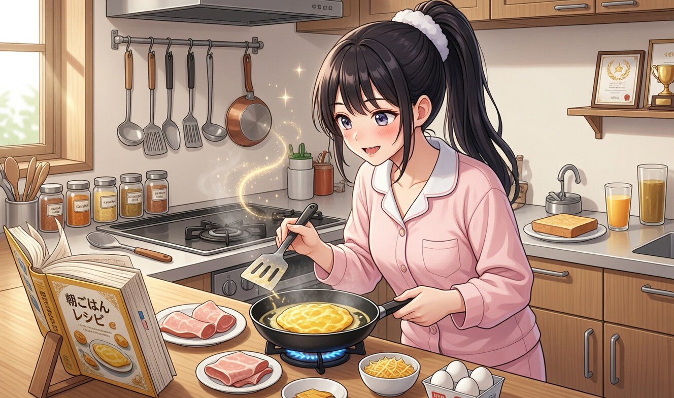 日本人女性25歳のデジタルイラスト。髪は白いシュシュで結っている。部屋着で朝にキッチンでオムレツをつくる。