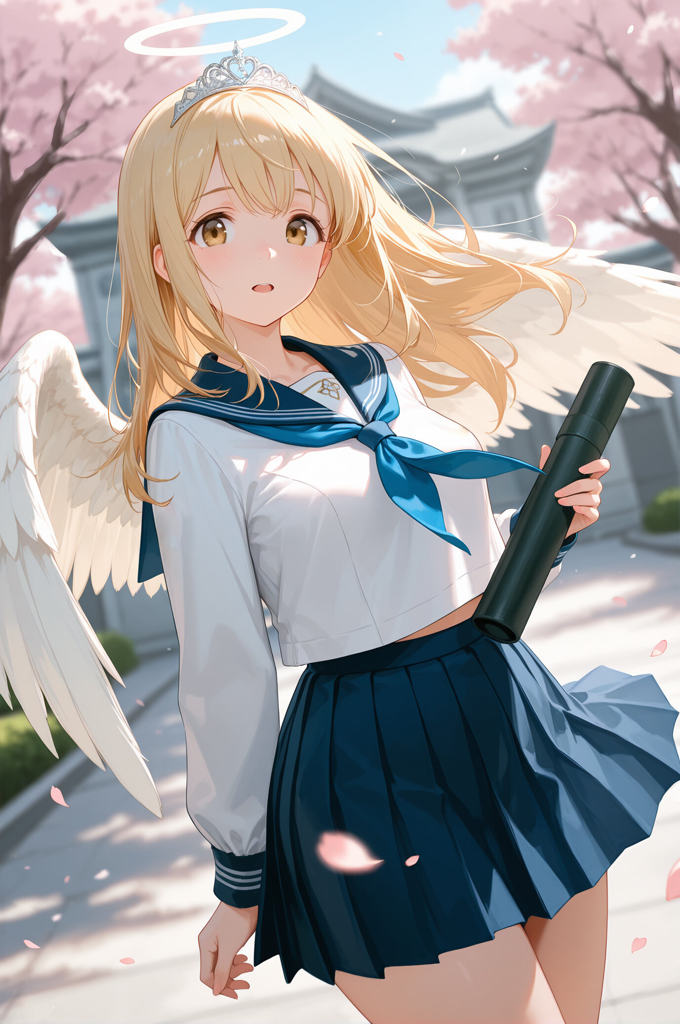masterpiece, best quality, absurdres, 8k, ultra detailed, aesthetic, very aesthetic, newest, <lora:Fixhands_anime_bdsqlsz_V1:0.5>, <lora:bold-16oa:-0.5>, (realistic:0.3),BREAK (spring,cherry blossoms,falling petals:1.3),(shallow depth of field,Gaussian Blur:1.6),1girl,blonde hair, long hair, brown eyes, (white angel wings:1.2),tiara,school uniform,serafuku, <lora:graduation_Illust_v1:0.45>(diploma tube, cherry blossoms, outdoors, looking at viewer,long sleeves,school gateway,school:1.2),open mouth,(cowboy shot,wide angle,wide shot:1.3),(tareme,curvy,medium breasts:1.3),<lora:USNR STYLE_XL_loha:0.7>