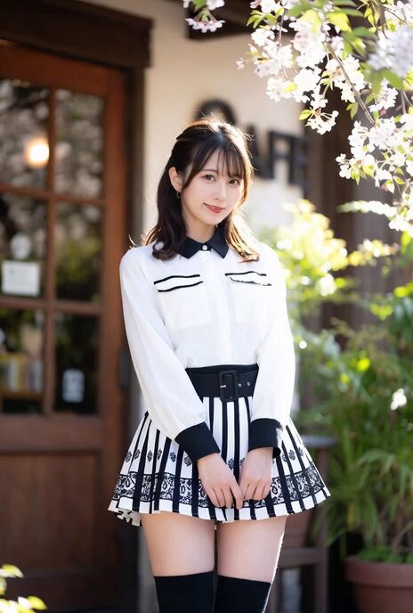 自然に風が吹いて、風の影響でスカートが上にめくれたが、素早く手で押さえて下着を見せずに、防いだ。